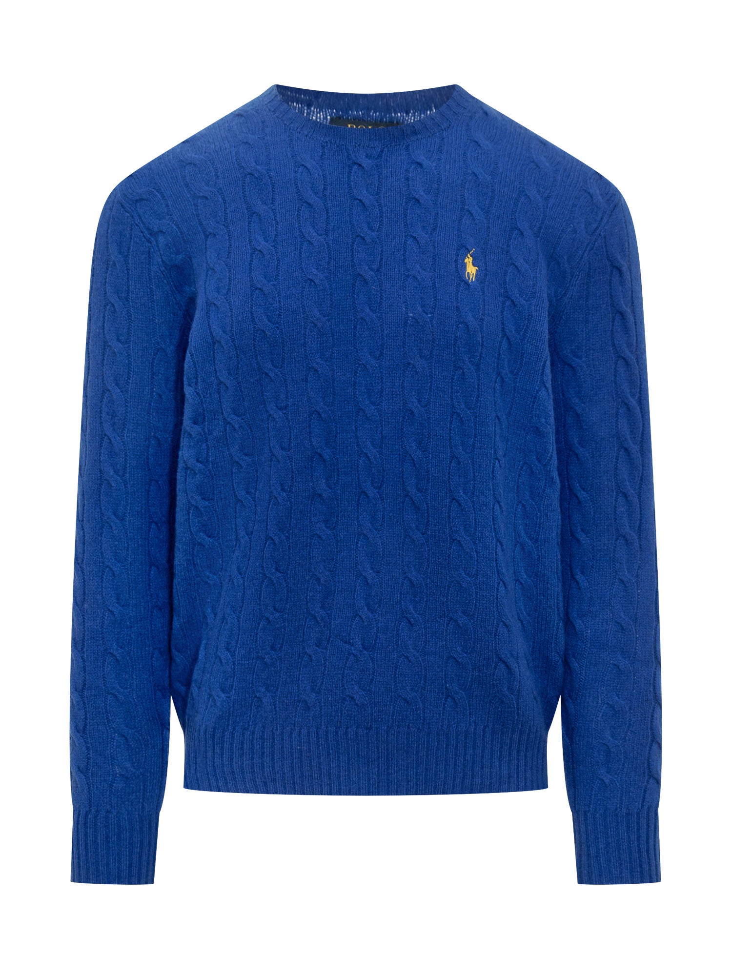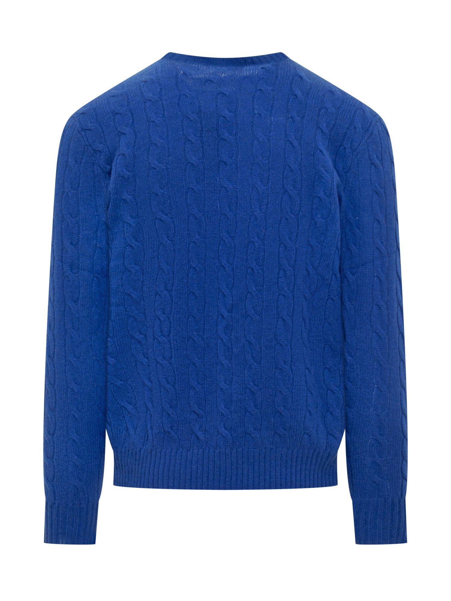 Maglione Polo Ralph Lauren in lana blu con lavorazione a treccia e logo ricamato sul petto.
