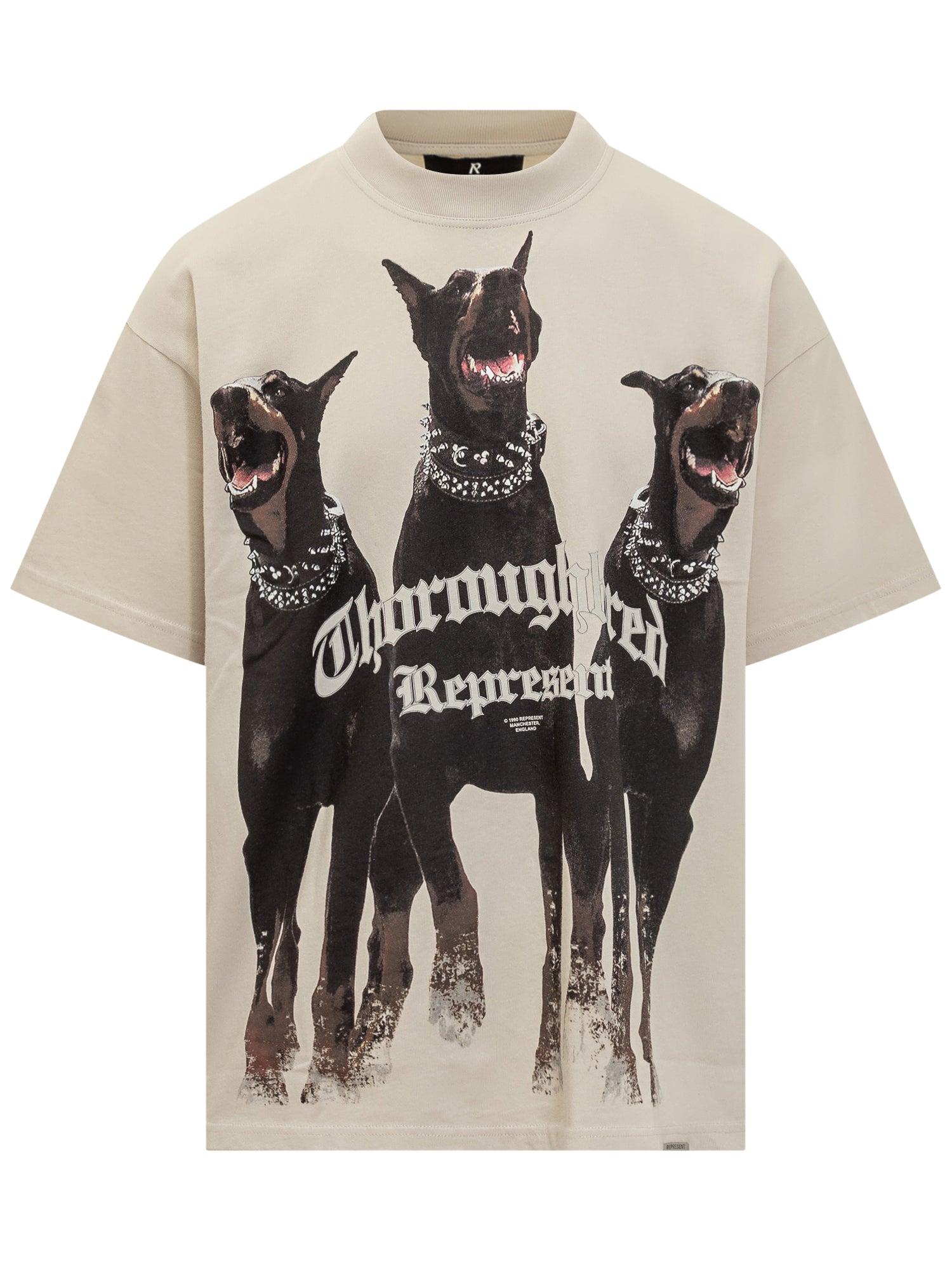 T-shirt Represent in cotone beige con grafica frontale di tre dobermann e scritta gotica.