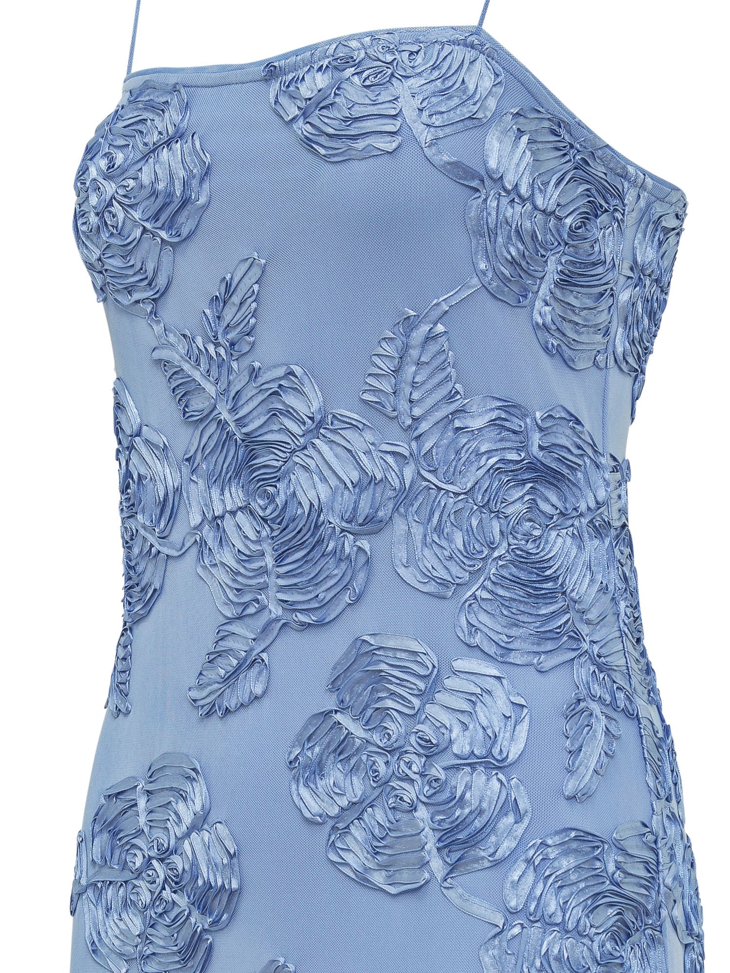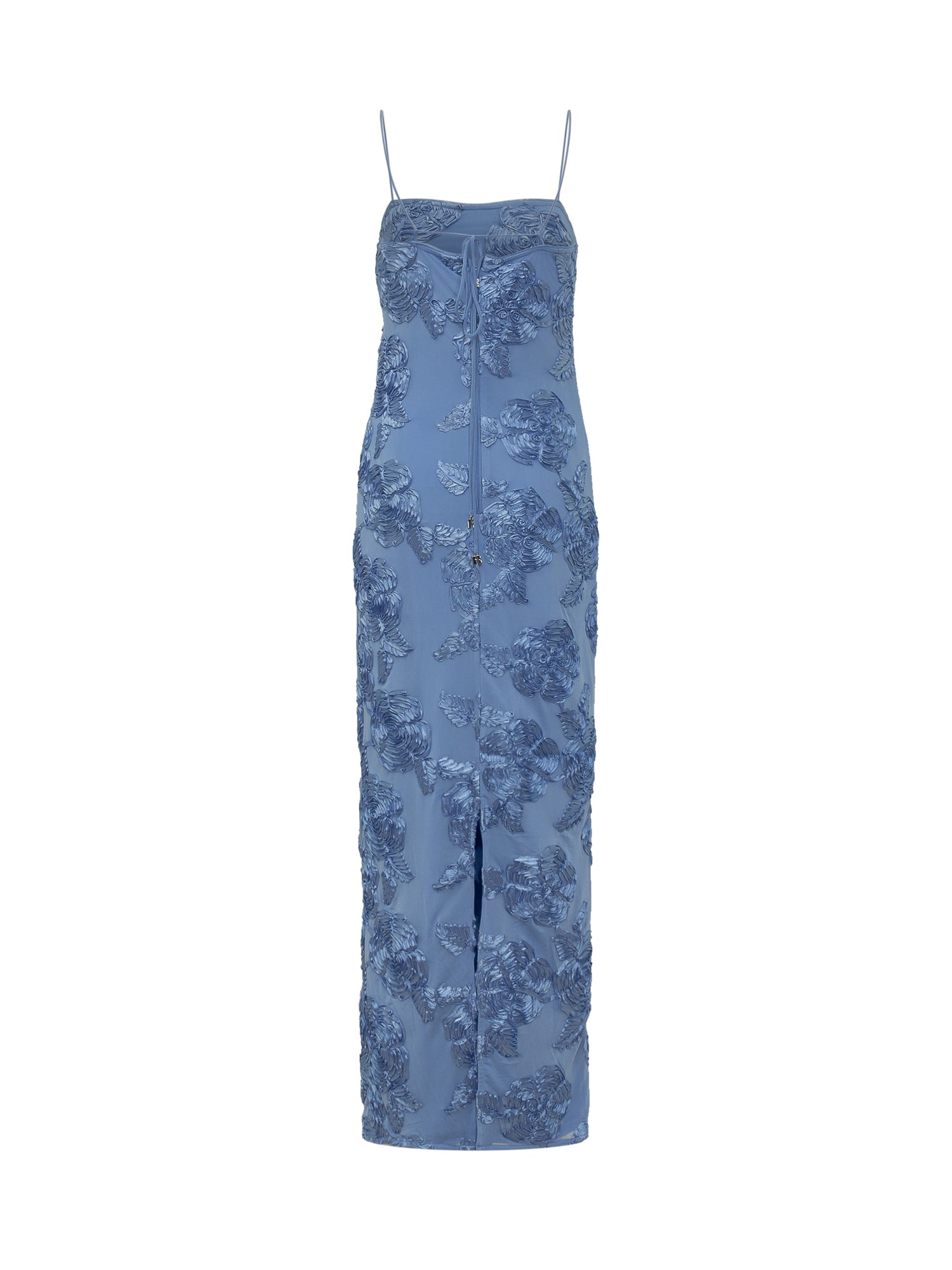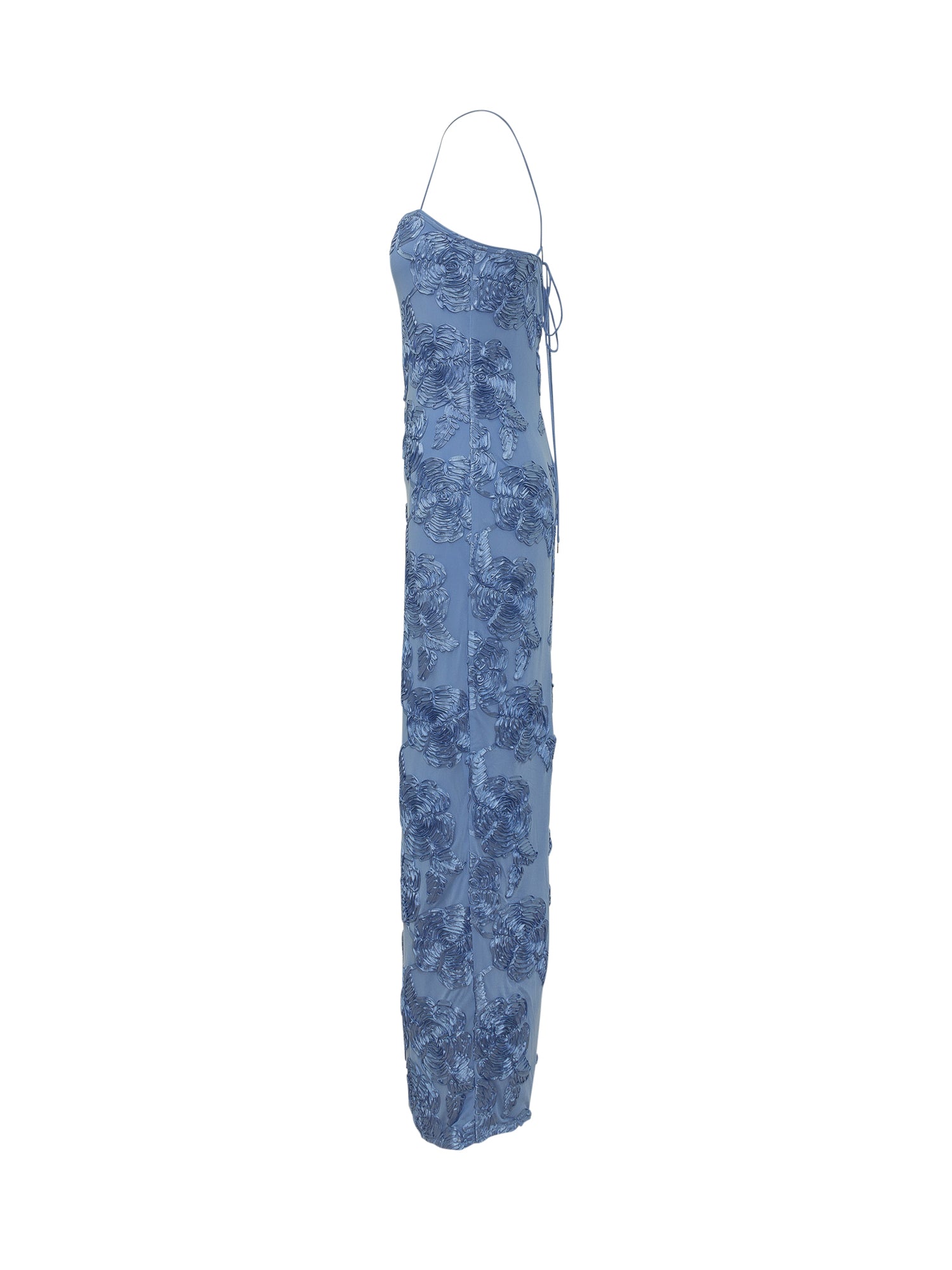 Abito slip lungo con ricamo floreale tridimensionale che aggiunge texture e raffinatezza. Le spalline sottili e la linea scivolata valorizzano la silhouette.