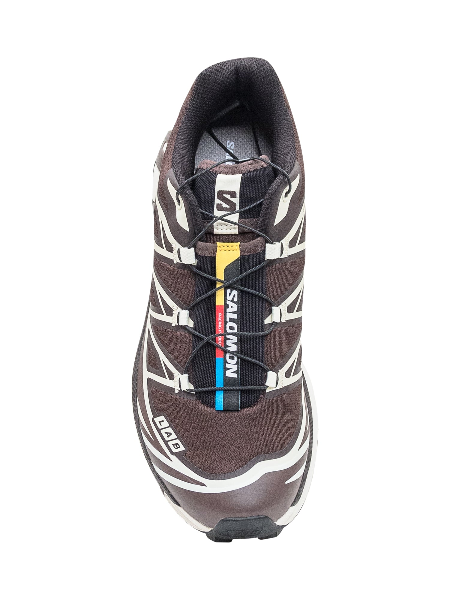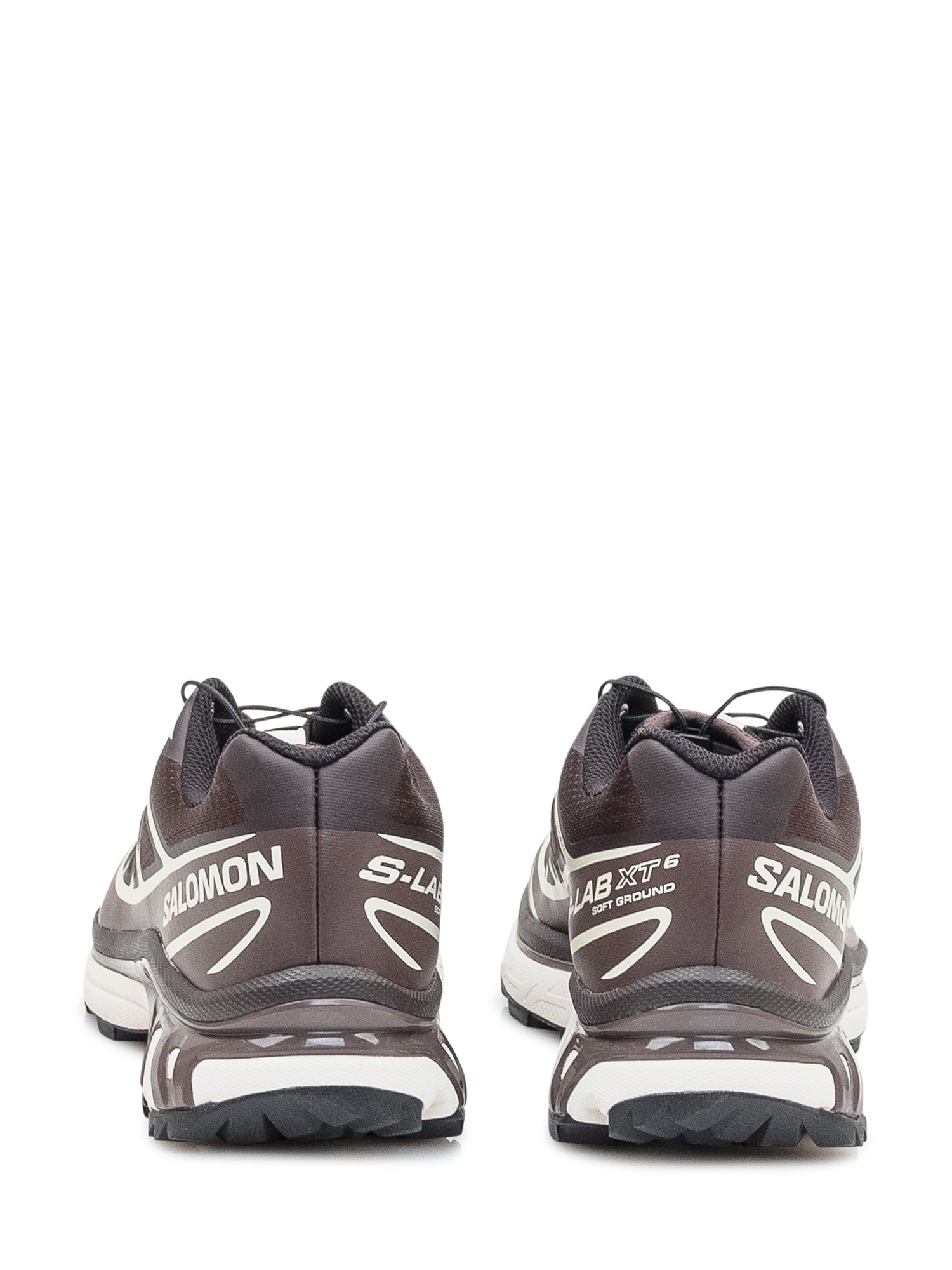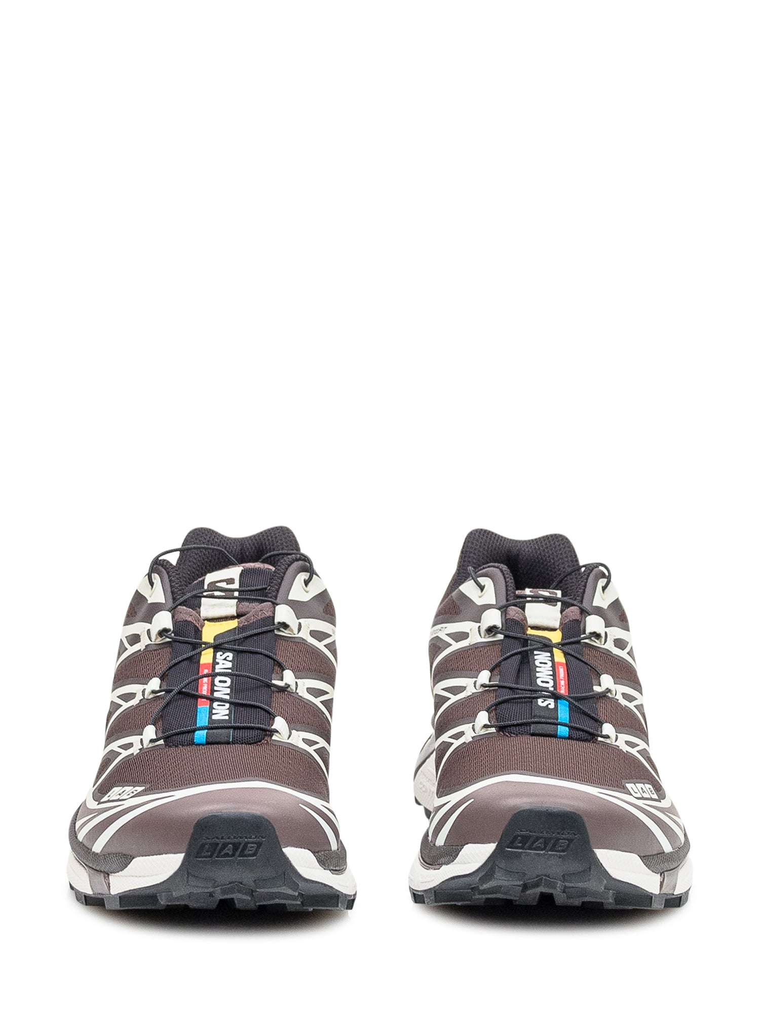 Sneakers Salomon XT-6 in tessuto tecnico marrone con dettagli bianchi e sistema di chiusura Quicklace. Dotate di suola Contagrip e intersuola ammortizzata per comfort e stabilità.