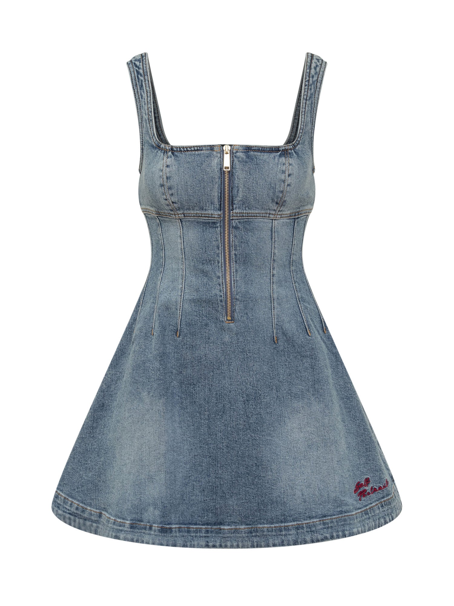 Abito mini in denim con corpetto strutturato e zip frontale che valorizza la silhouette. Gonna svasata e cuciture modellanti per un look casual e femminile.