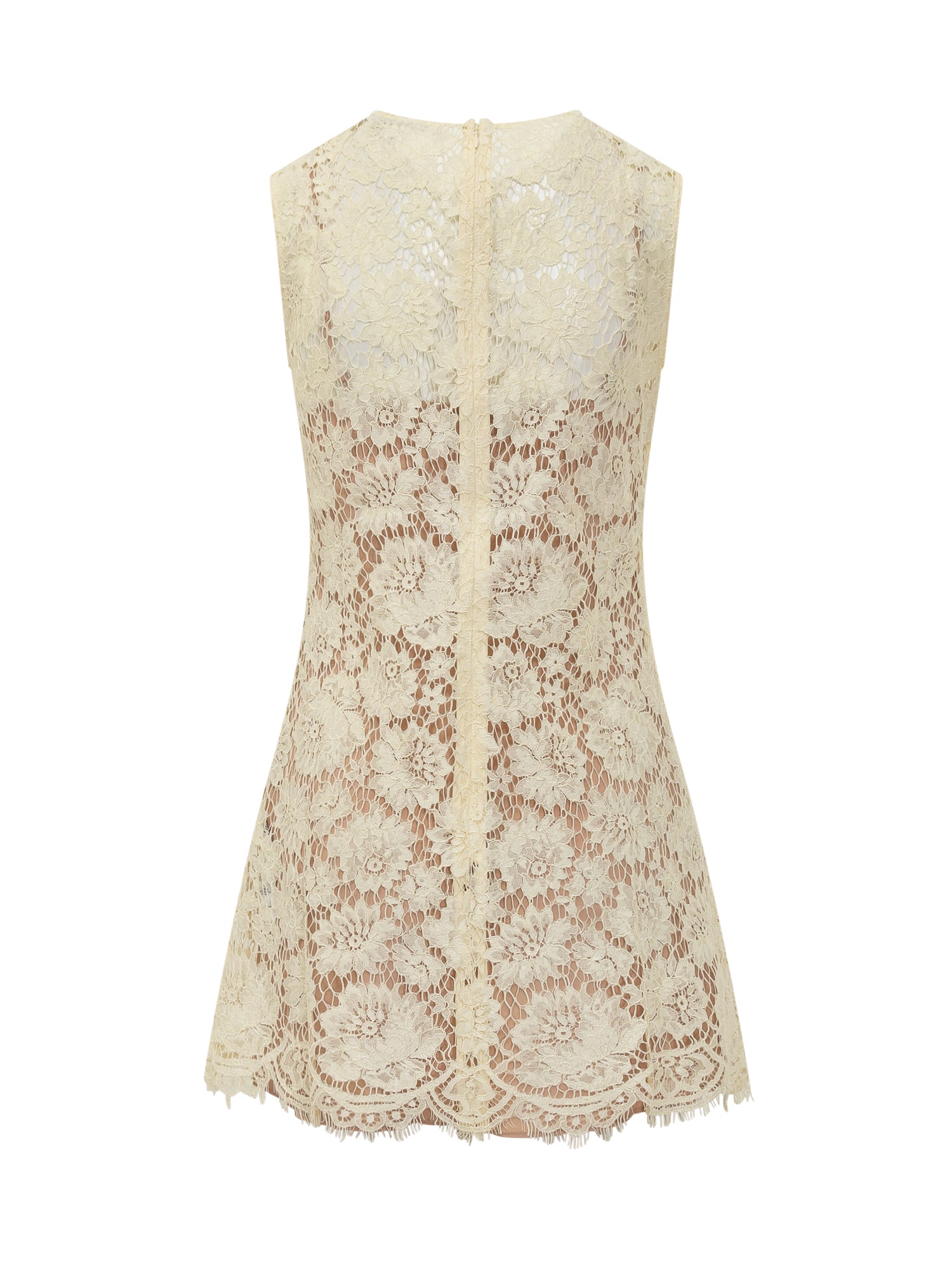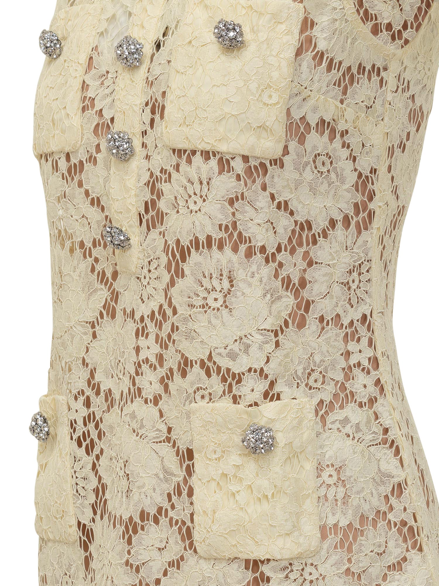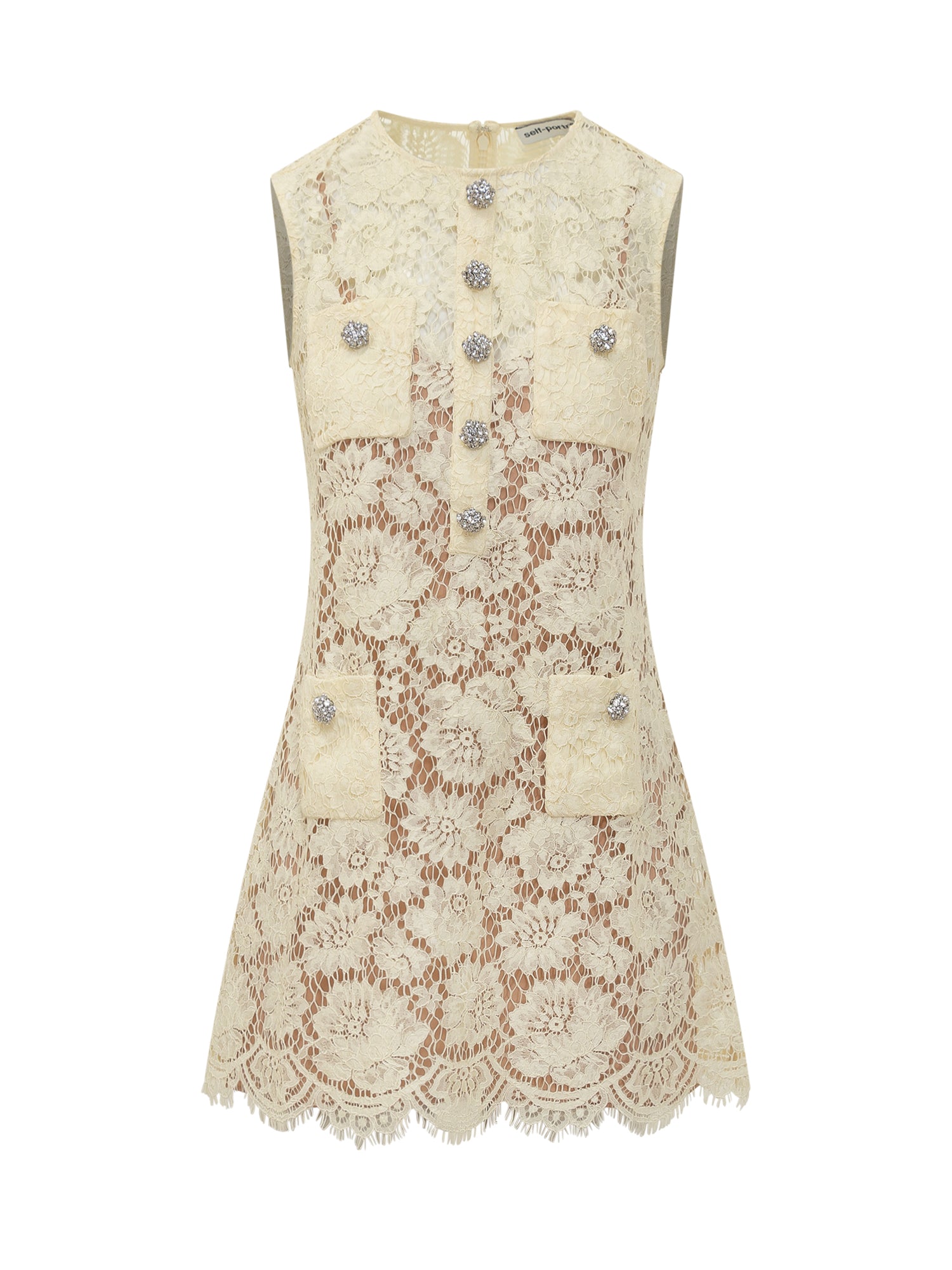 Abito mini in pizzo ricamato con profili smerlati, tasche applicate e bottoni gioiello che aggiungono luminosità. La silhouette leggermente svasata crea un look elegante.