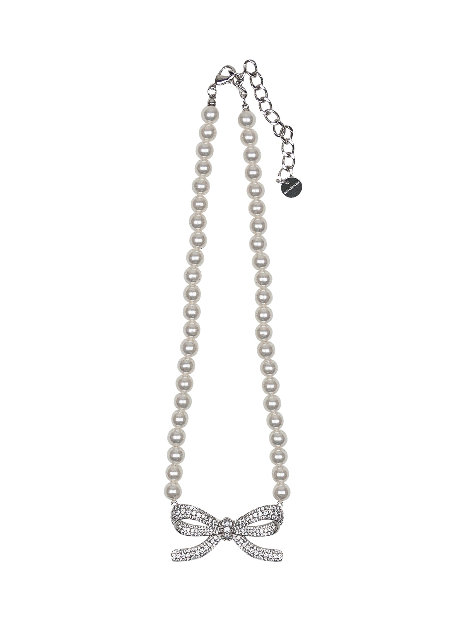Collana a girocollo in perle. Ciondolo a forma di fiocco con diamanti. Chiusura con moschettone.
