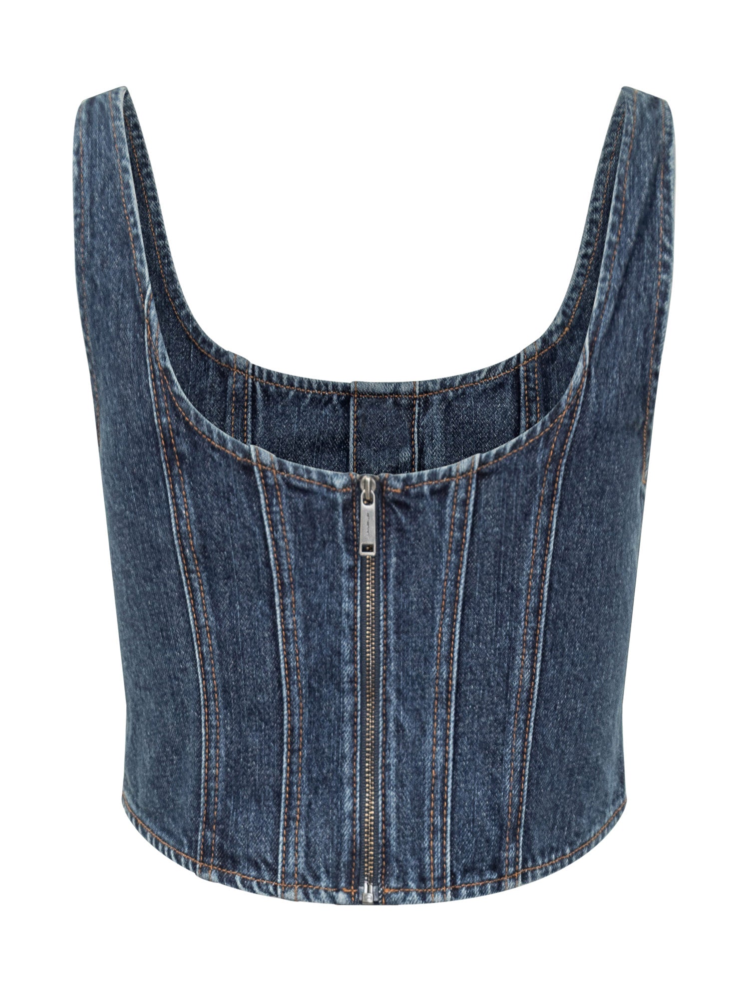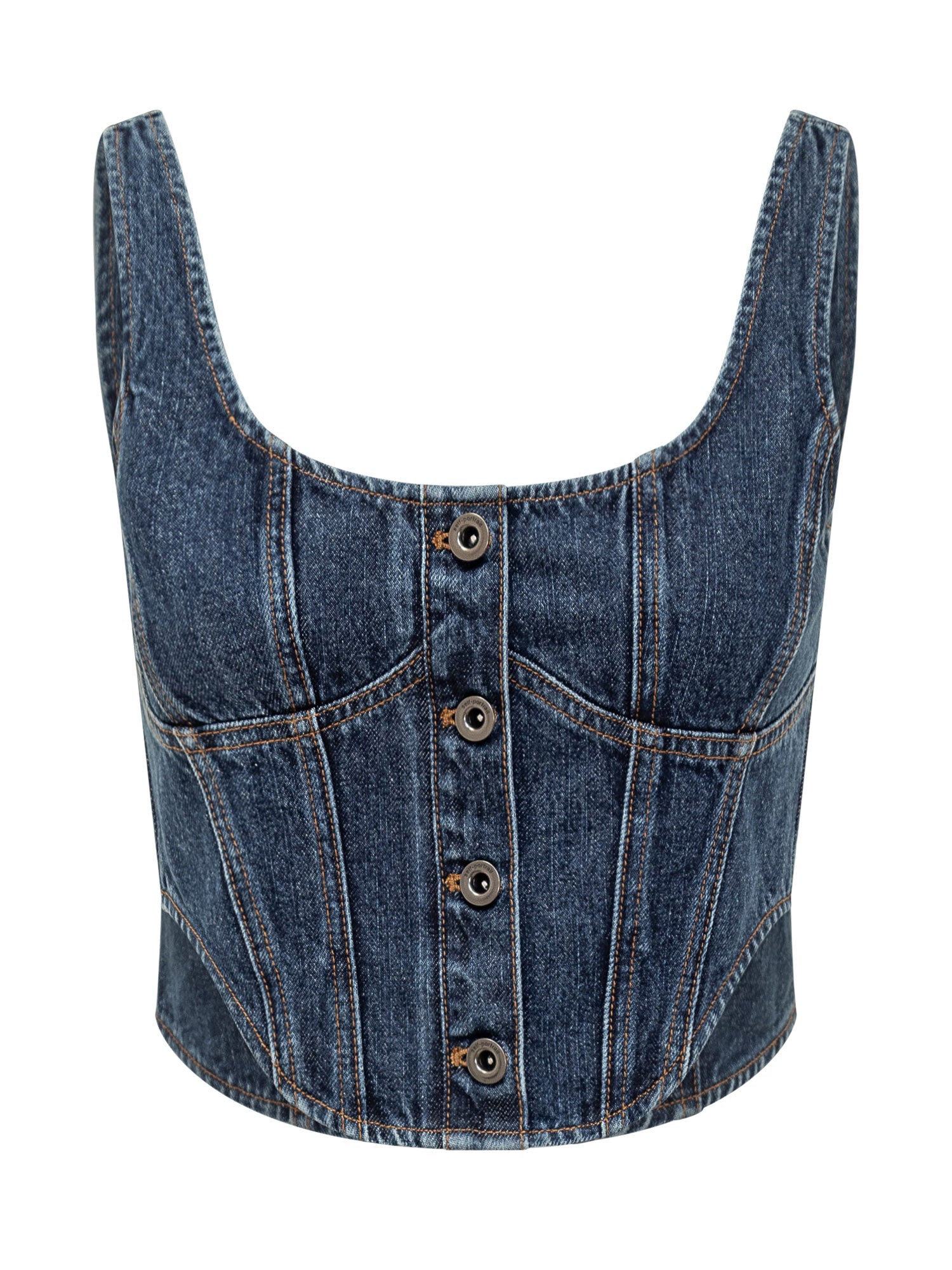 Corsetto in denim a silhouette strutturata con cuciture a contrasto e chiusura frontale a bottoni.