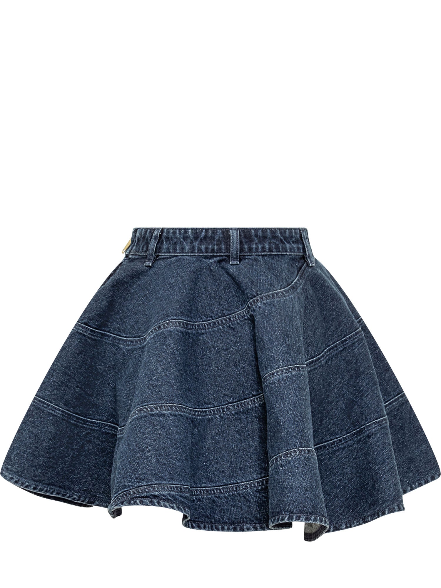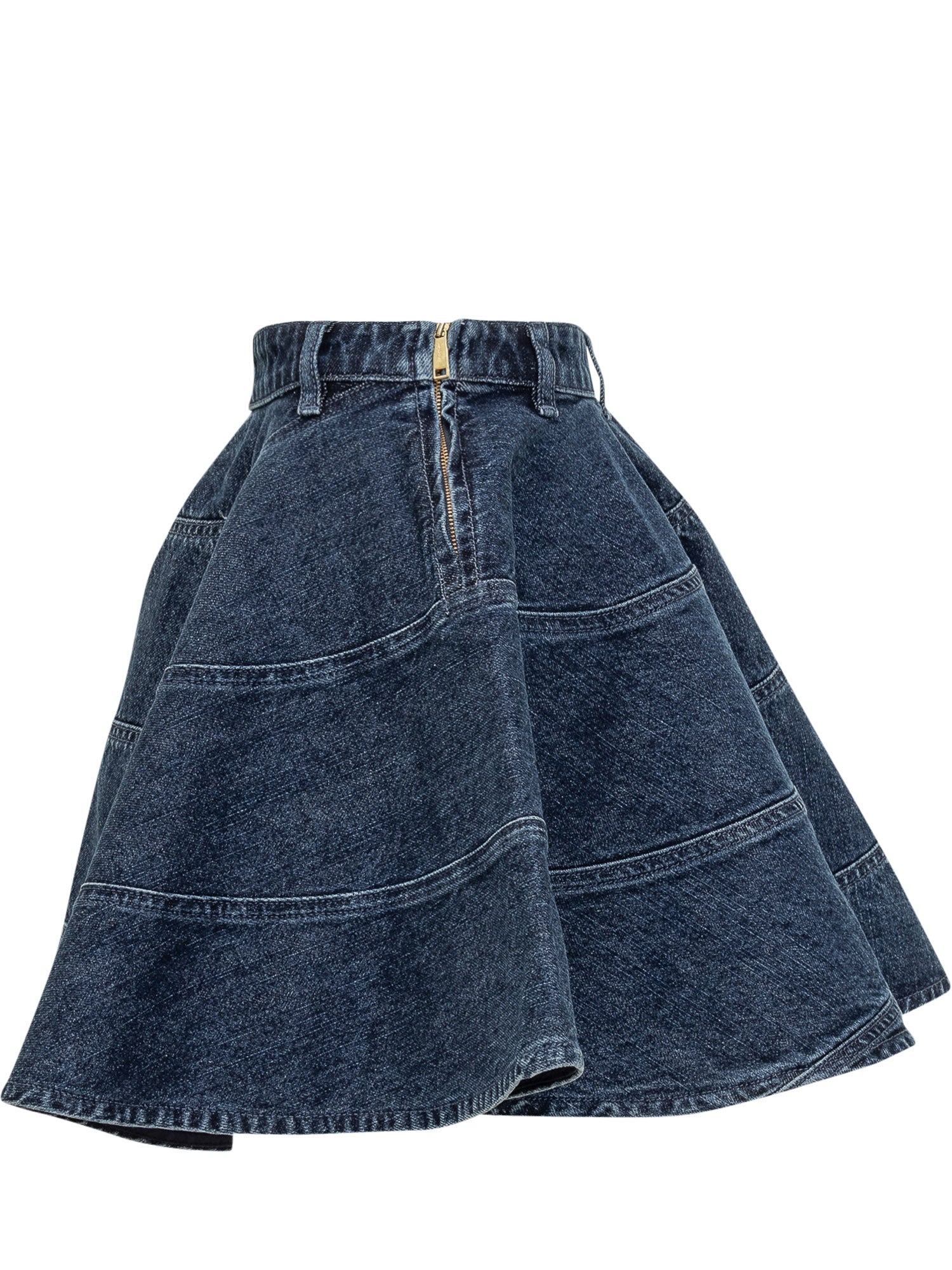 Gonna mini in denim con costruzione svasata e cuciture a pannelli che donano volume e movimento. Un modello versatile e contemporaneo.
