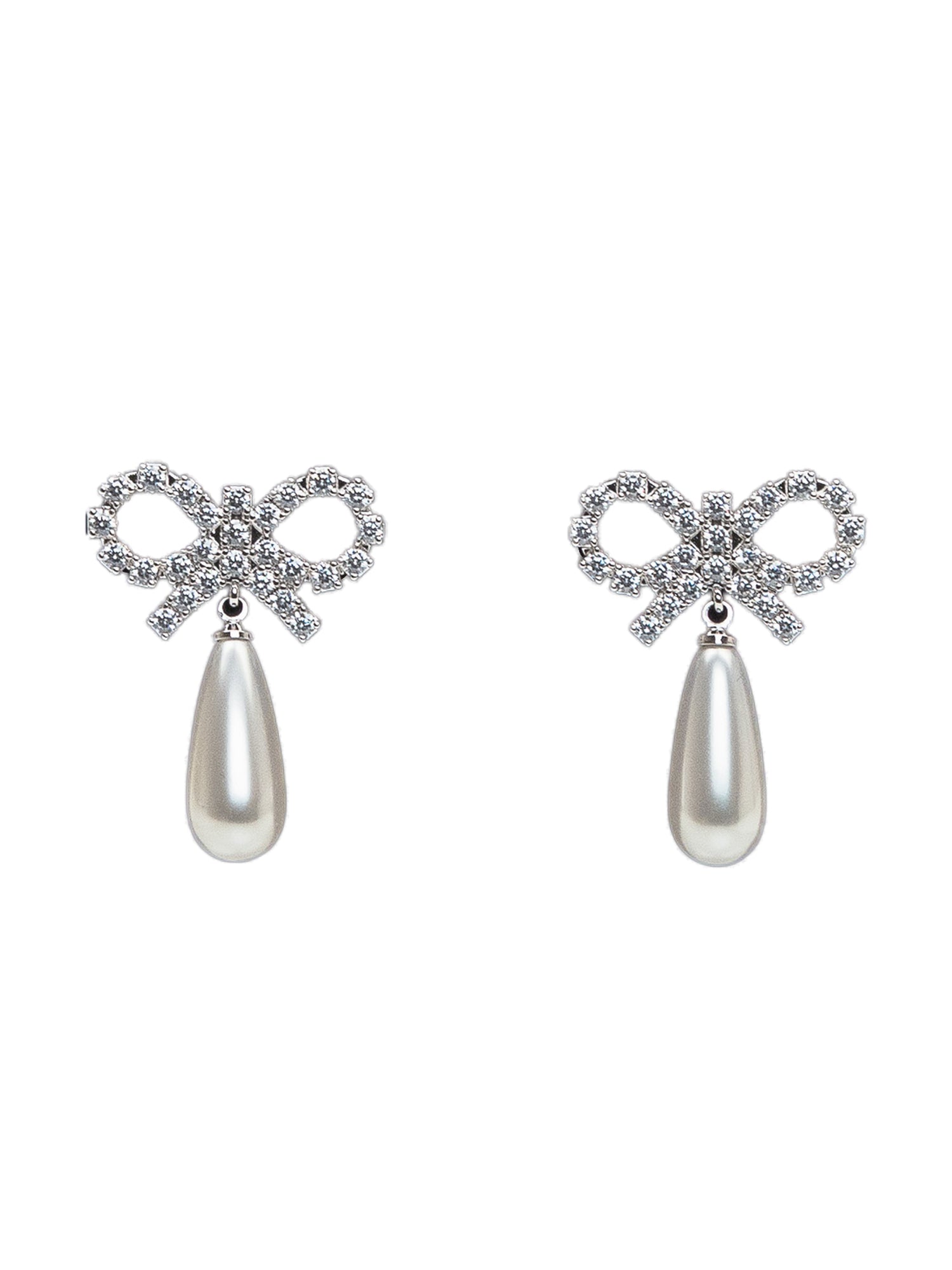 Orecchini pendenti con fiocco tempestato di cristalli e goccia perlata.