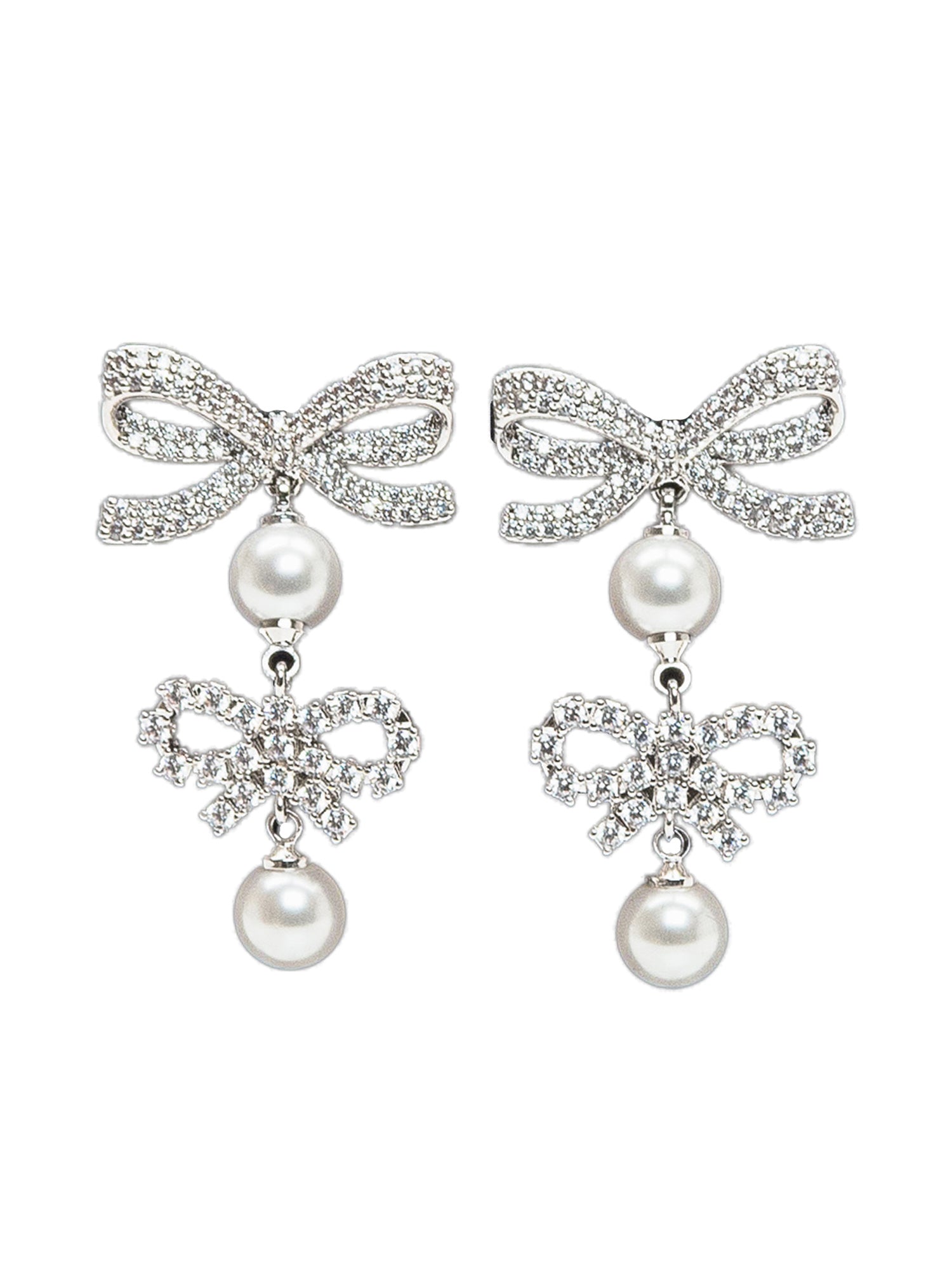 Orecchini pendenti con doppio fiocco decorato da cristalli e perle.