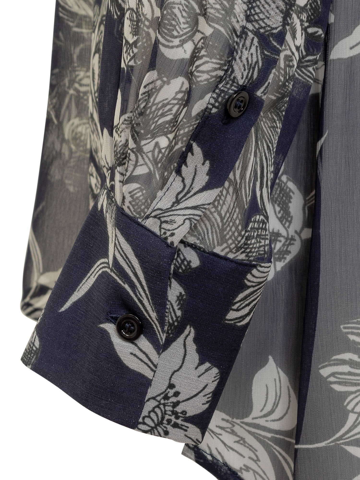 Camicia a maniche lunghe in viscosa. Colletto classico. Chiusura con bottoni. Polsi con bottoni. Due tasche sul davanti. Apertura a goccia e chiusura con nastro sul retro. Motivo floreale all-over.