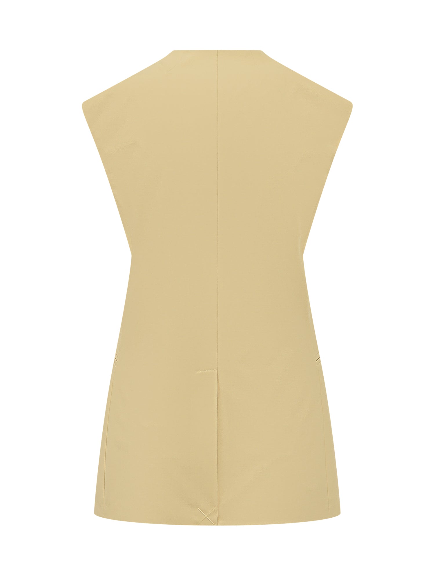 Gilet Lora con scollo a V e chiusura frontale con bottone. Modello senza maniche con tasca sul petto e tasche frontali a filetto. Linea strutturata dal taglio contemporaneo.