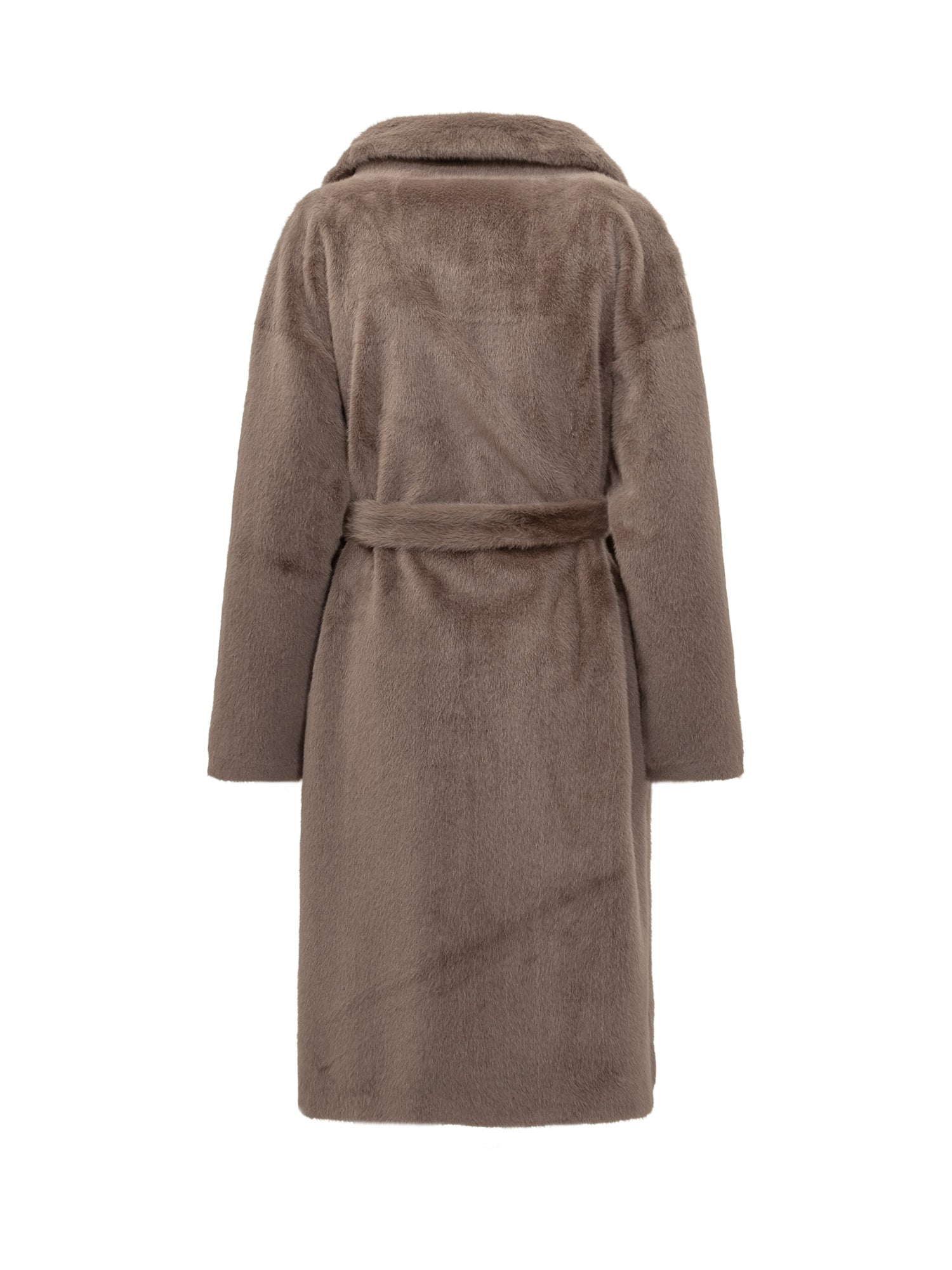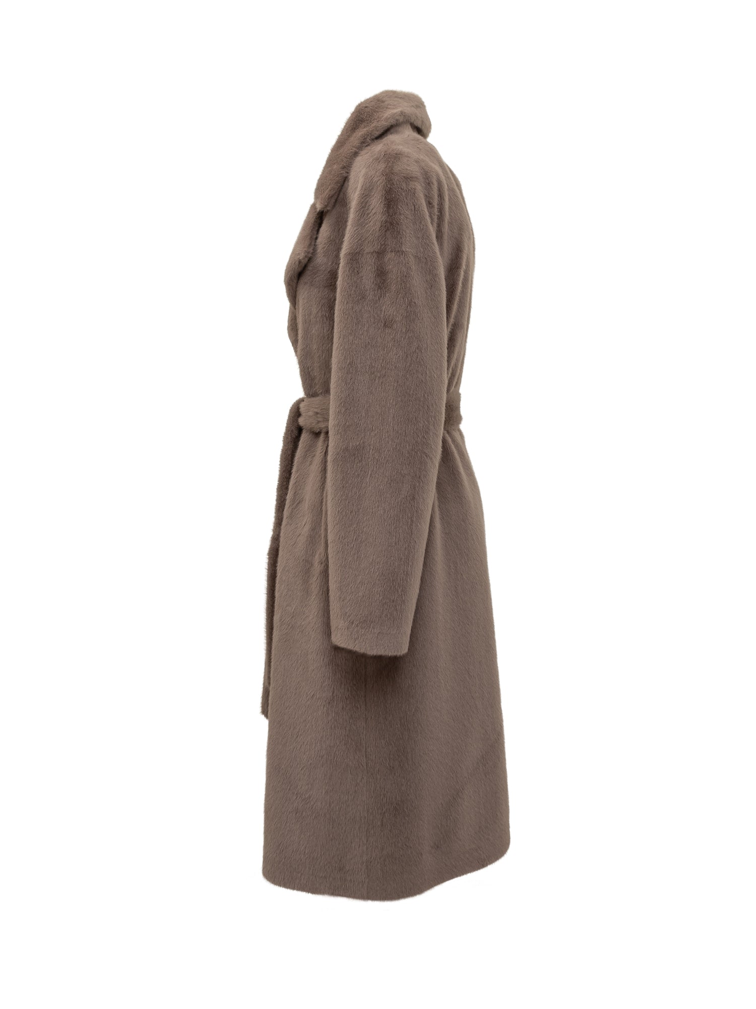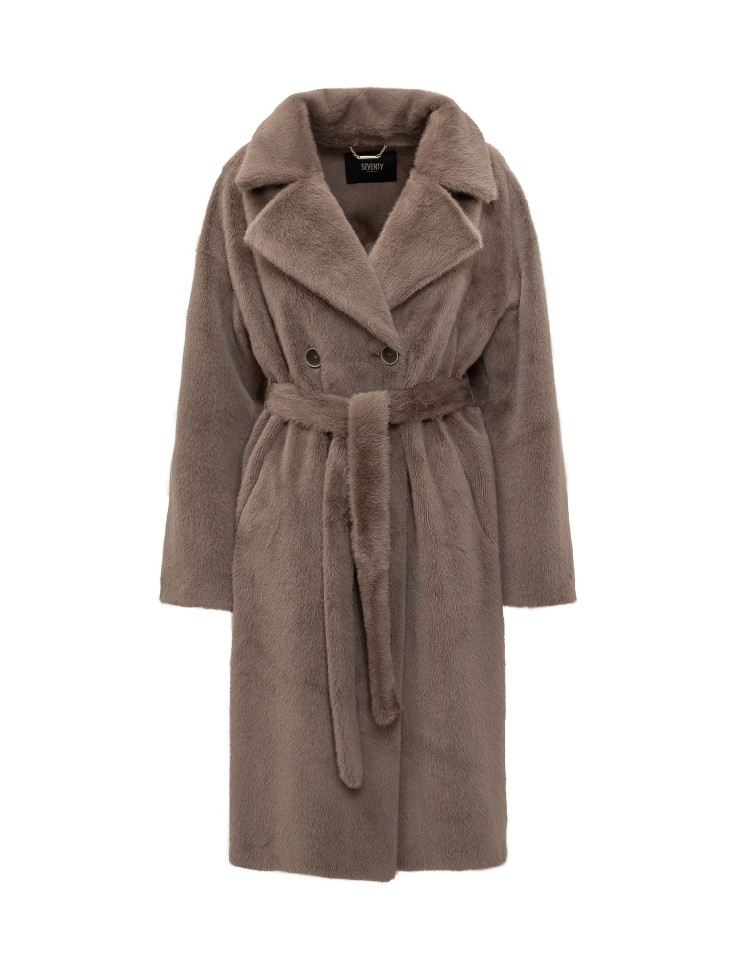 Cappotto Seventy 19.70 in morbida eco pelliccia color taupe con chiusura doppiopetto e cintura in vita. Collo a revers e linea avvolgente.