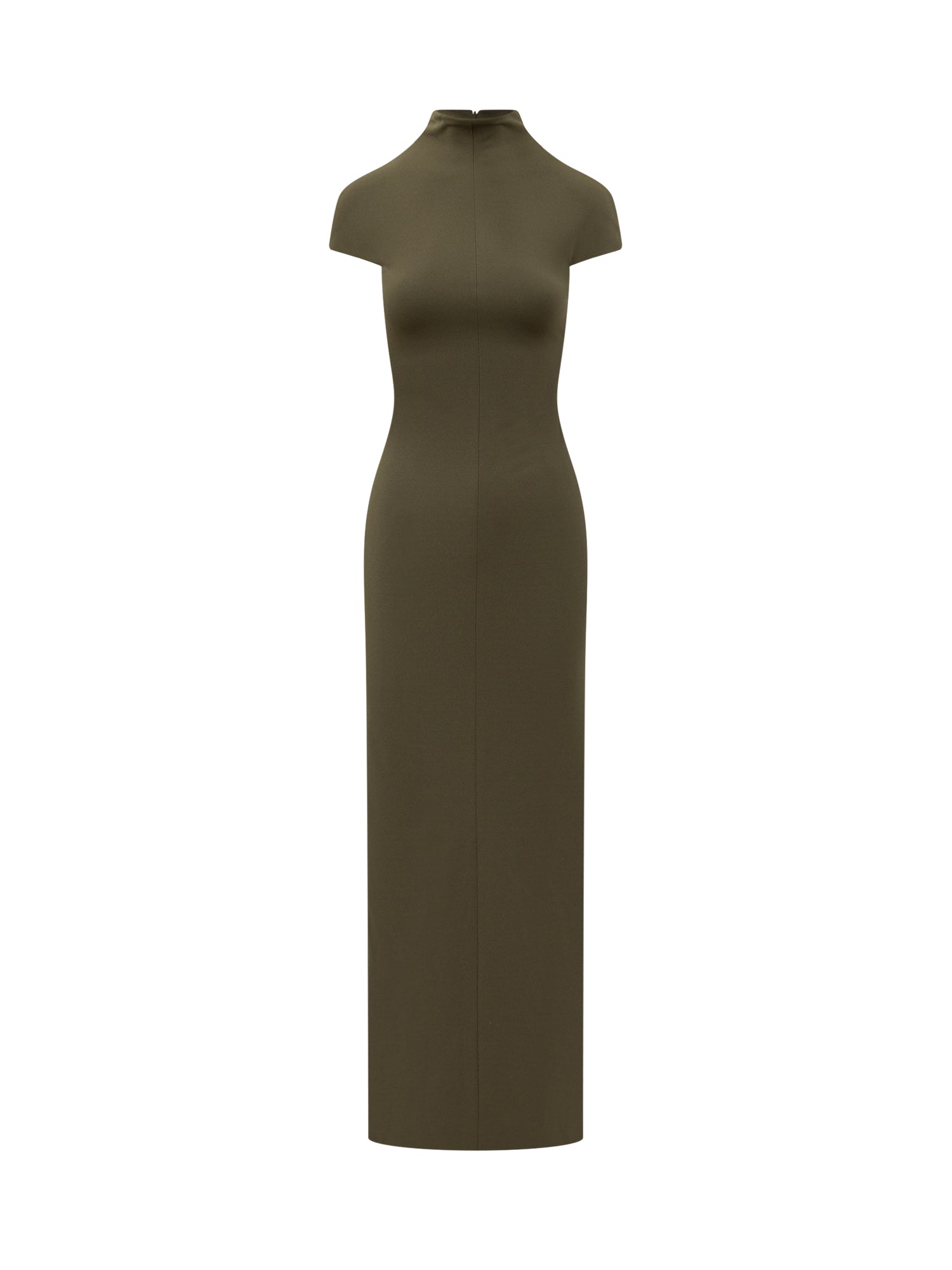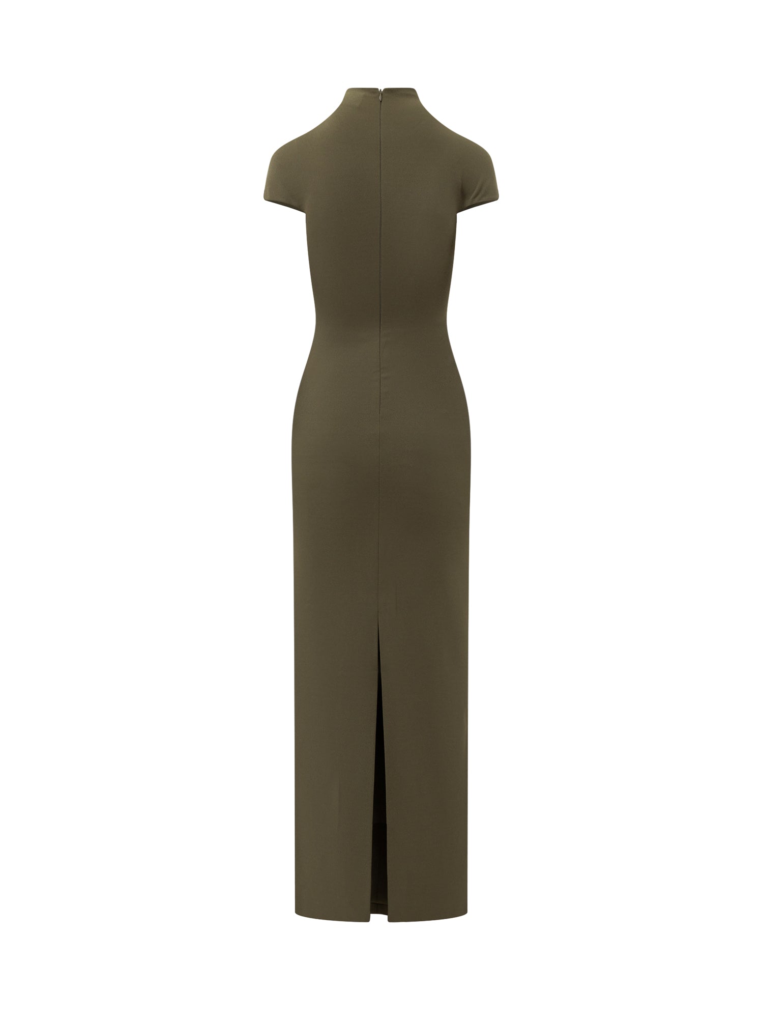 Abito lungo dalla linea scivolata con collo alto e maniche corte.