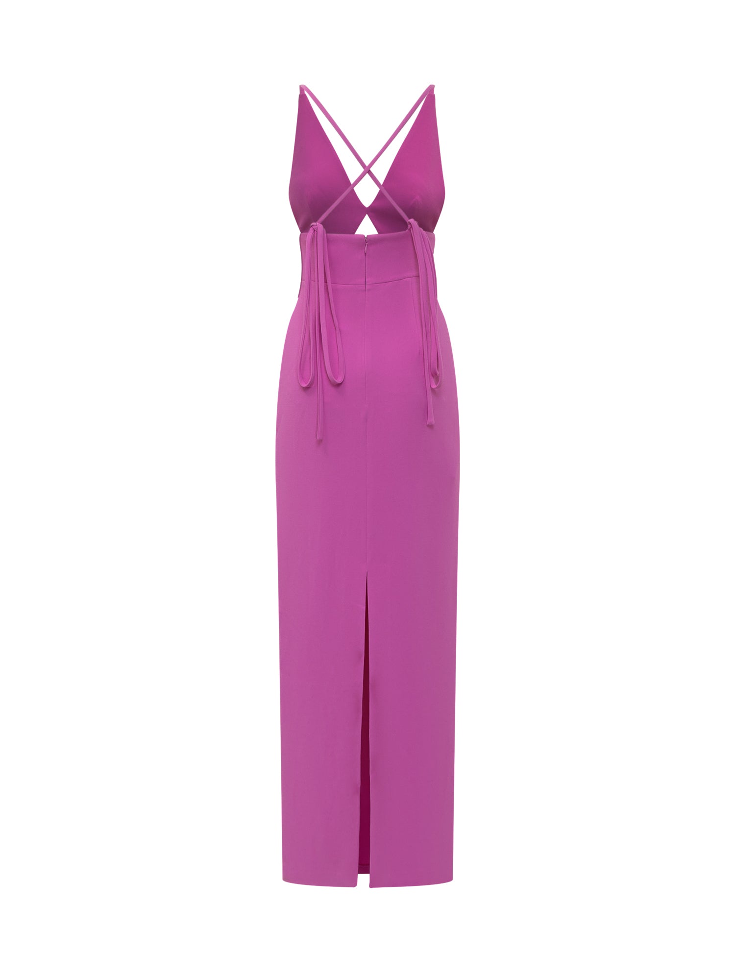 Abito lungo Solace London in tonalità fucsia con scollo profondo e spalline sottili incrociate.