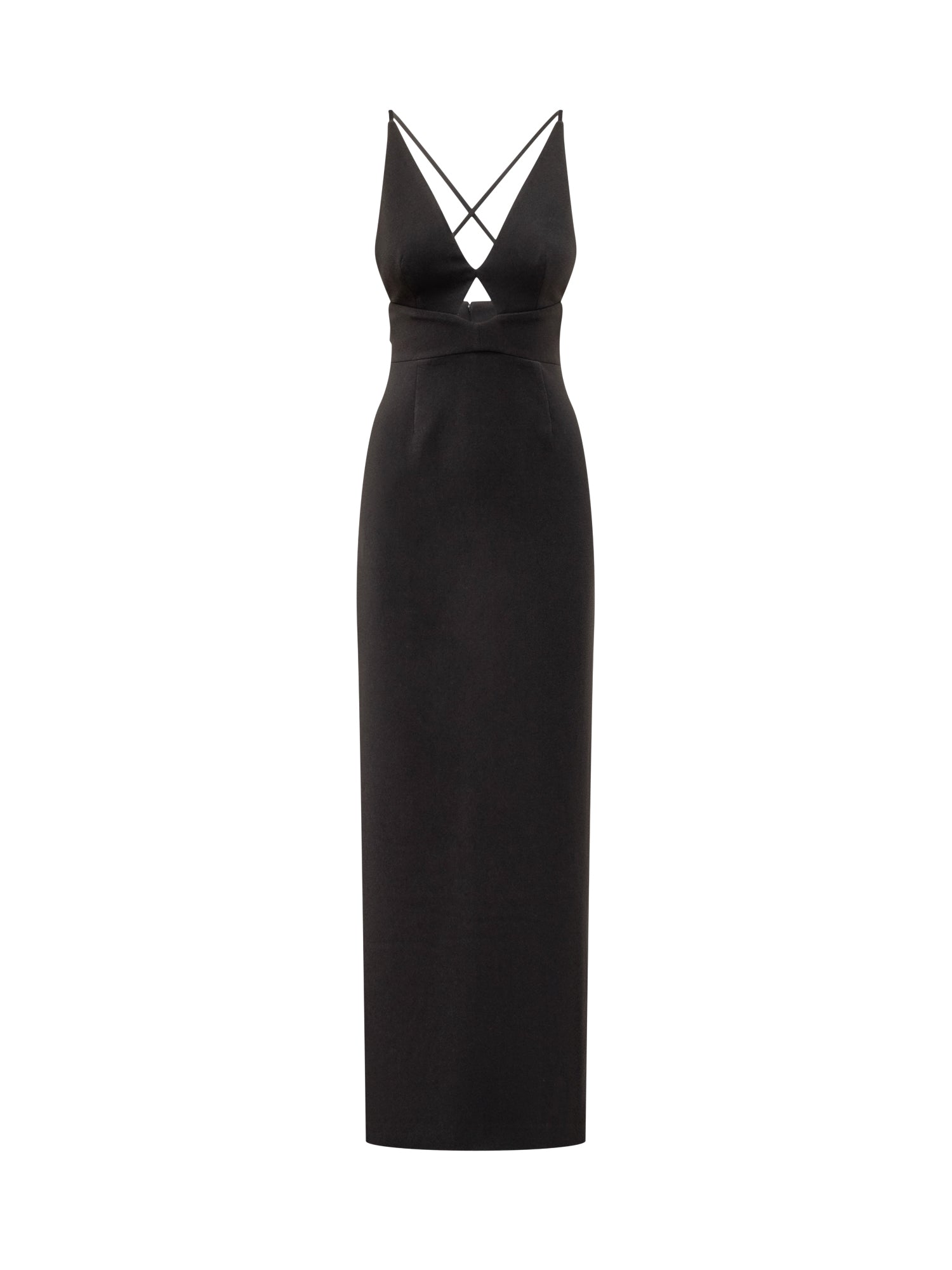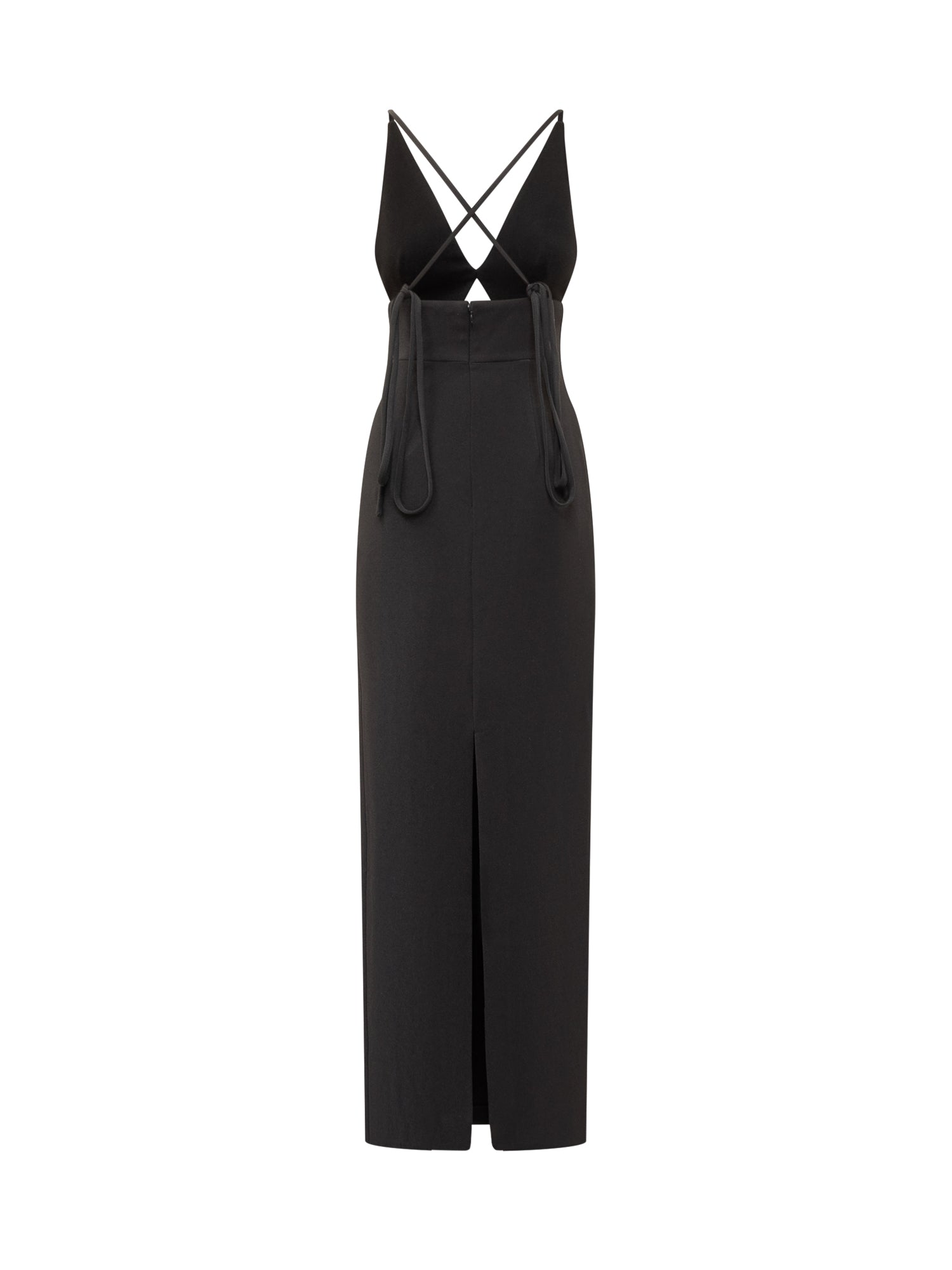 Abito lungo Solace London in tessuto nero con scollo profondo e spalline sottili incrociate.
