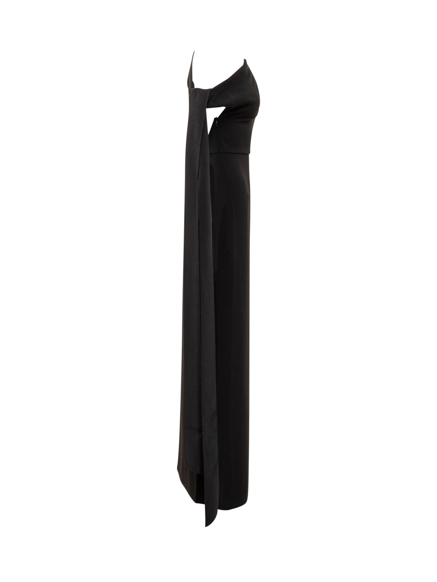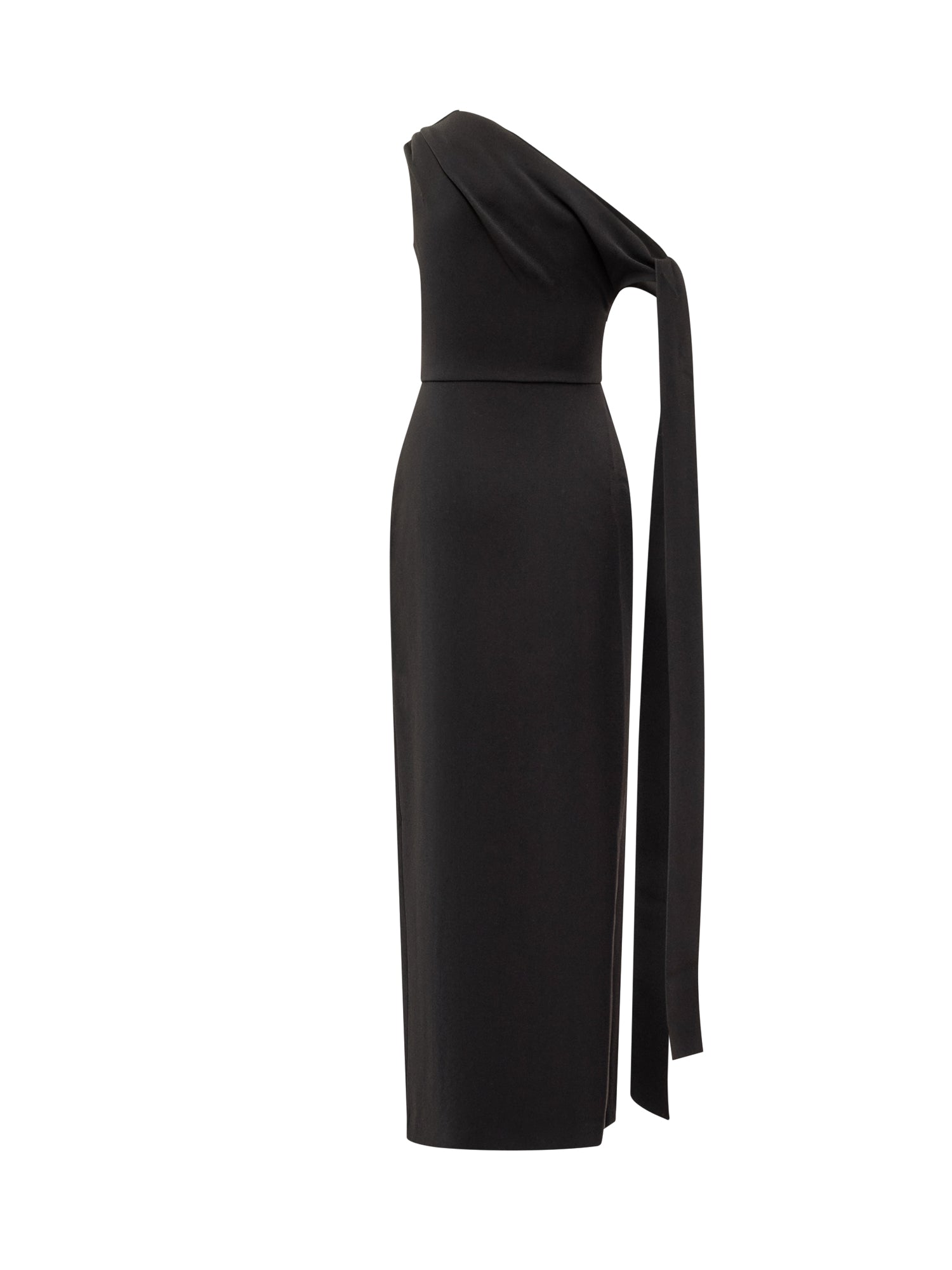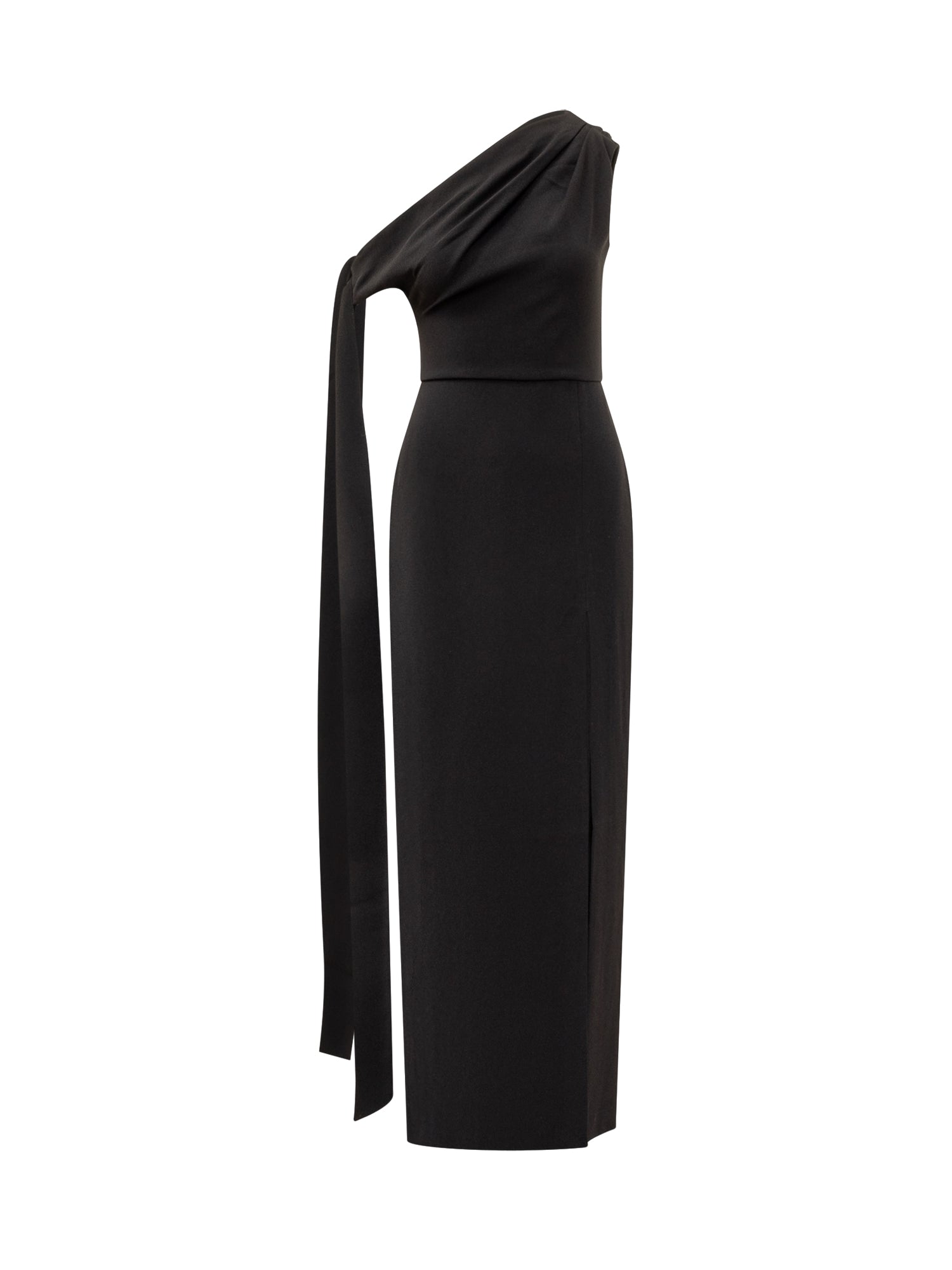 Abito lungo Solace London nero con elegante scollo monospalla e dettaglio drappeggiato. La linea aderente e lo spacco laterale donano raffinatezza e modernità.