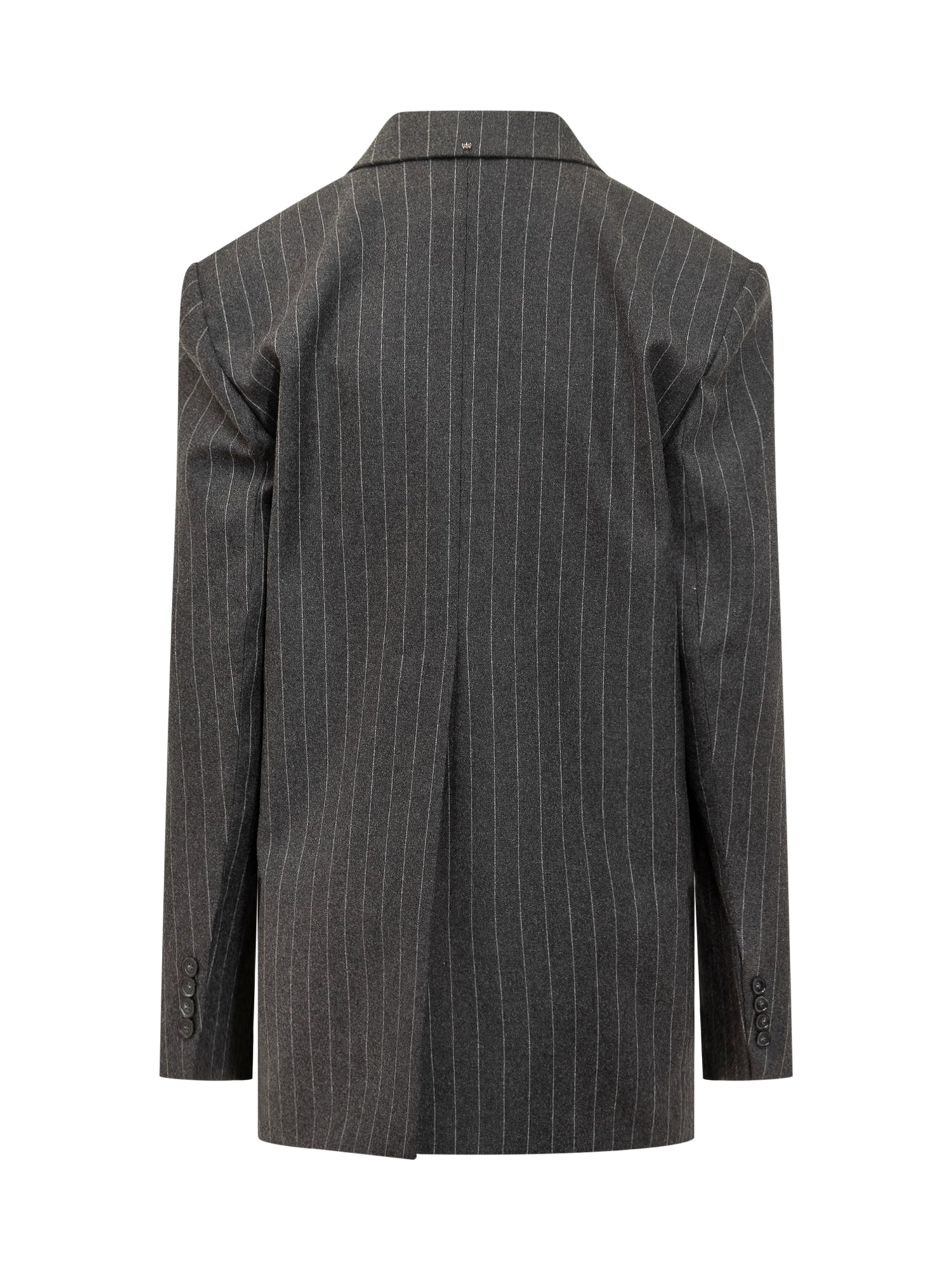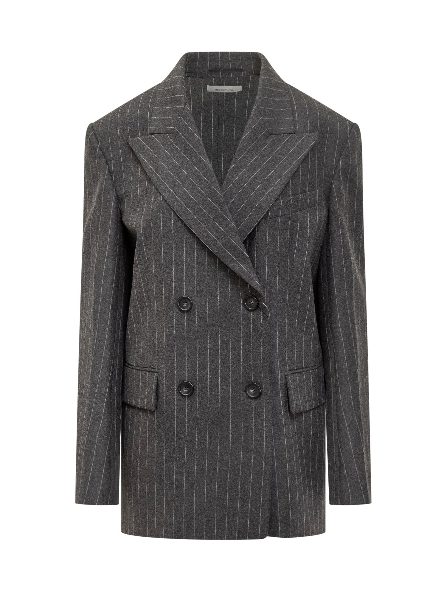Blazer doppiopetto Sportmax in lana grigia con righe gessate. Modello sartoriale con revers ampi, tasche con patta e chiusura a bottoni.