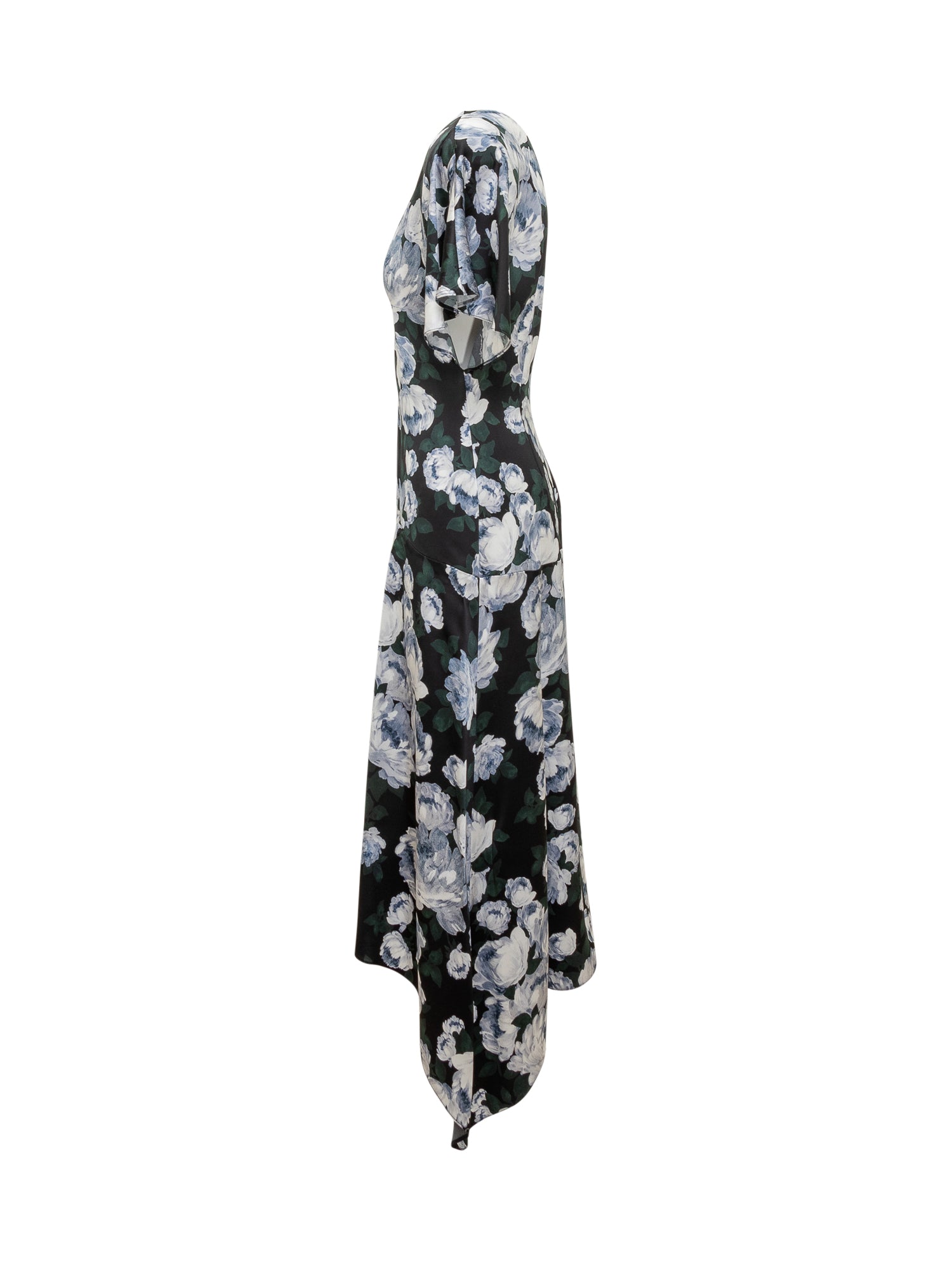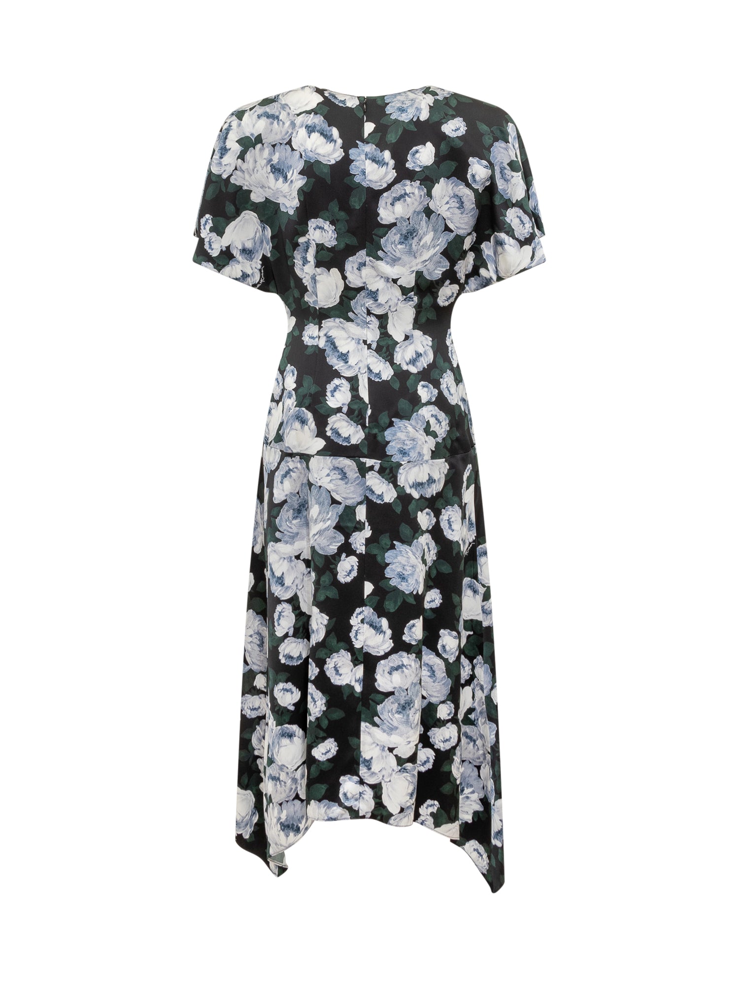 Abito midi leggero con stampa floreale e scollo a V, caratterizzato da maniche morbide e orlo asimmetrico. La silhouette fluida dona movimento ed eleganza.