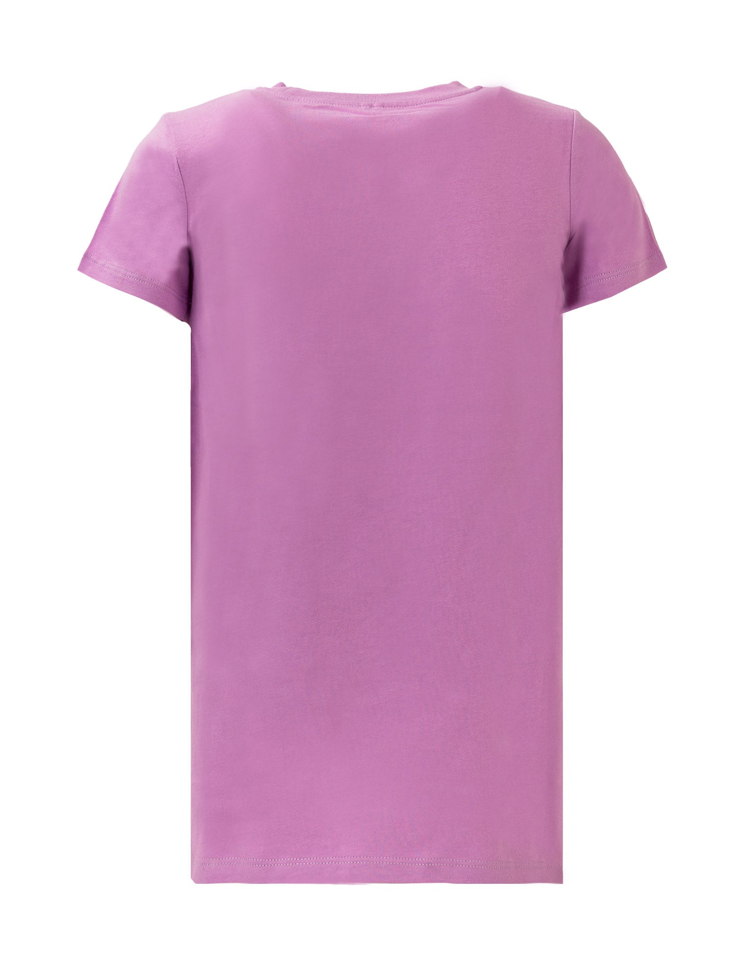Abito rosa a maniche corte. Girocollo. Collo a costine. Dettaglio stella con strass e frange sul davanti.