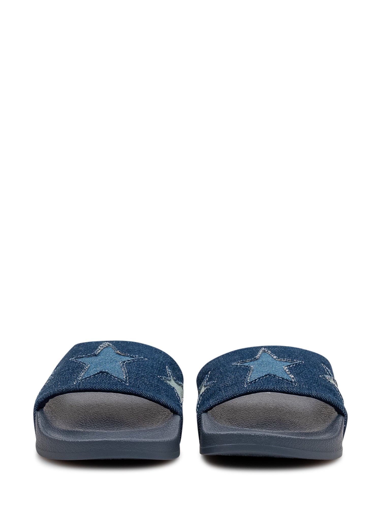 Sandali modello slide con fascia in denim decorata da applicazioni a stella a contrasto. Suola piatta in materiale leggero e resistente, ideale per il comfort quotidiano. Design casual e versatile, perfetto per la stagione estiva.