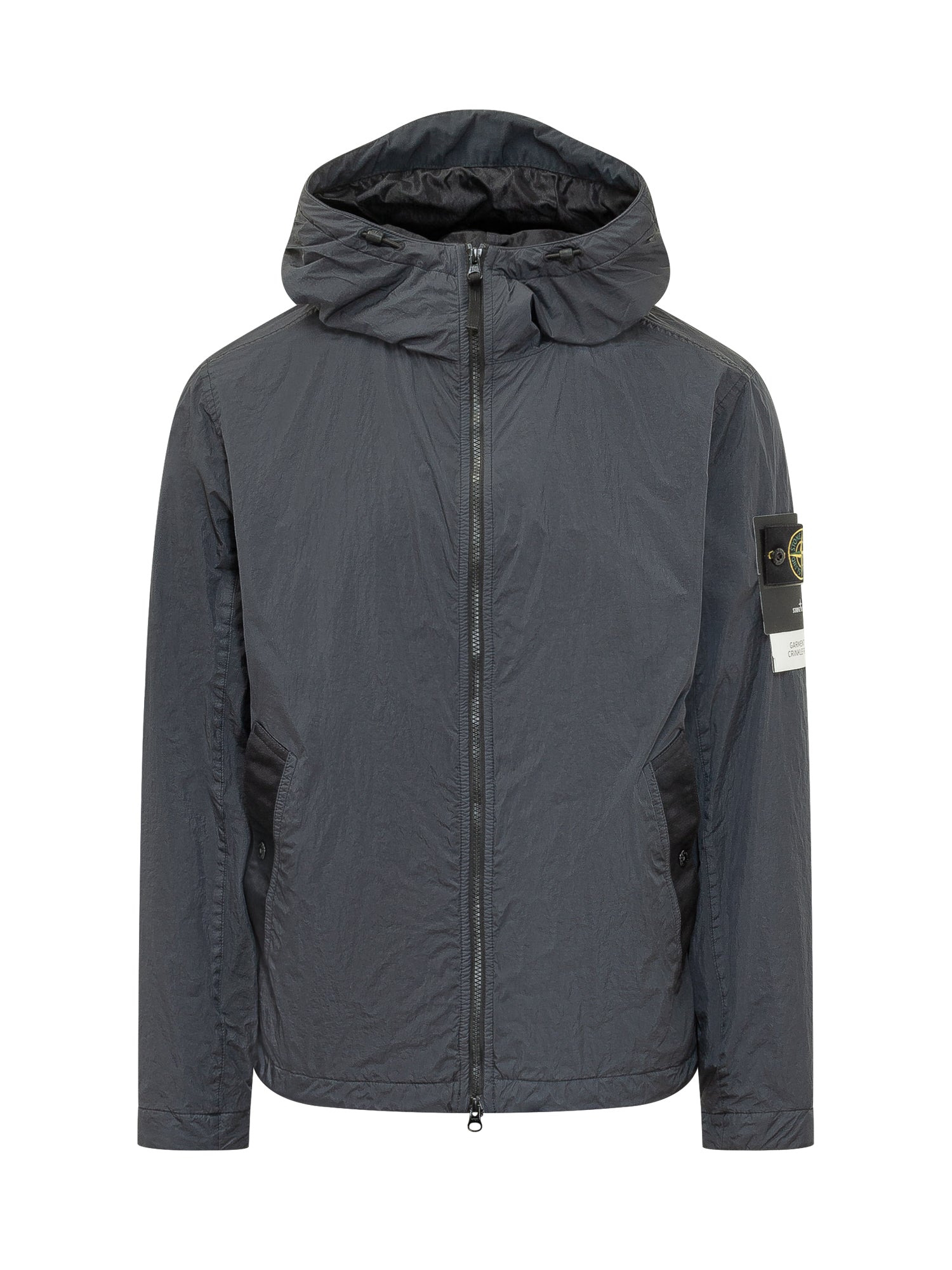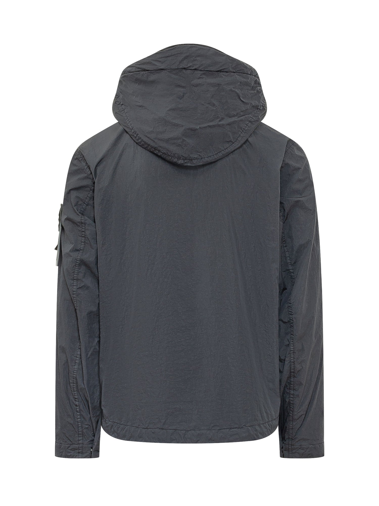 Giacca con cappuccio regolabile e chiusura frontale con zip. Realizzata in tessuto tecnico leggero con finitura stropicciata, tasche laterali con bottone e dettaglio patch sulla manica. Ideale per look urbani e funzionali.