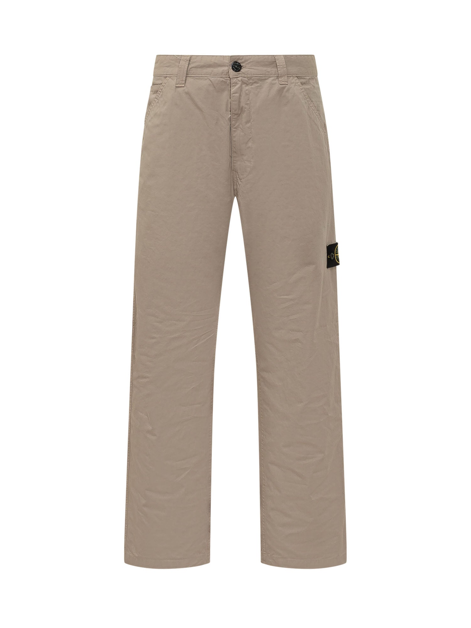 Pantaloni da uomo in tessuto leggero con vestibilità regolare e gamba dritta. Il modello presenta chiusura con bottone e zip, tasche laterali oblique, passanti per cintura e iconico patch logo applicato sulla gamba.