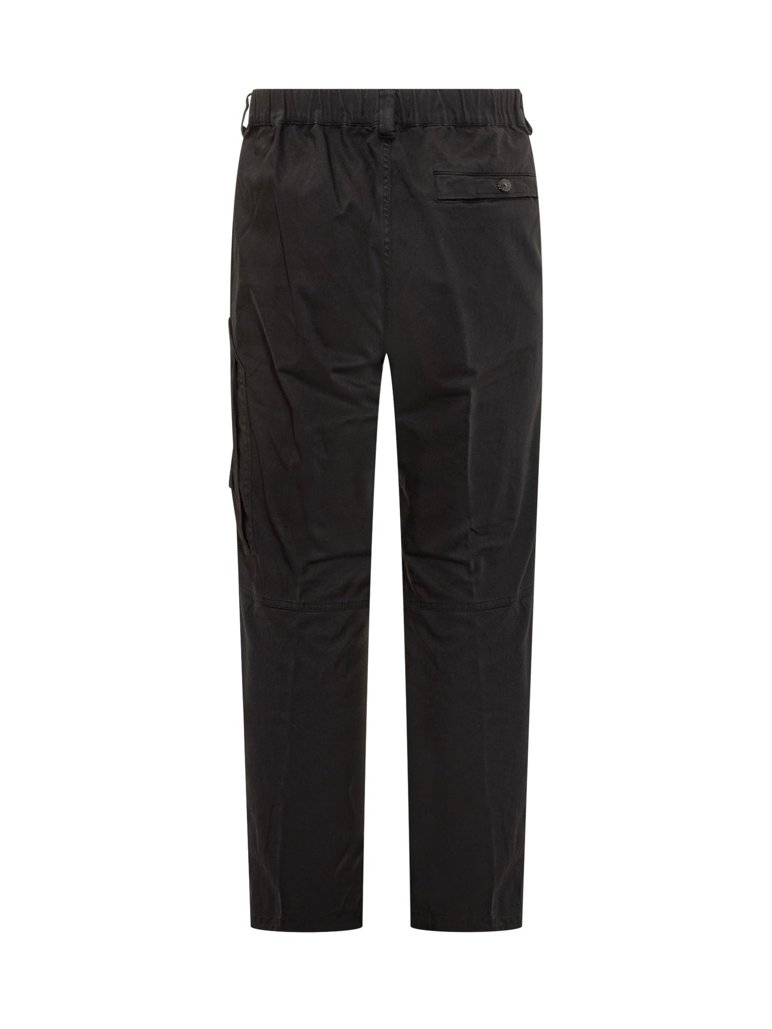Pantaloni cargo Stone Island in cotone nero con tasche laterali, chiusura frontale e iconica patch logo sulla gamba.