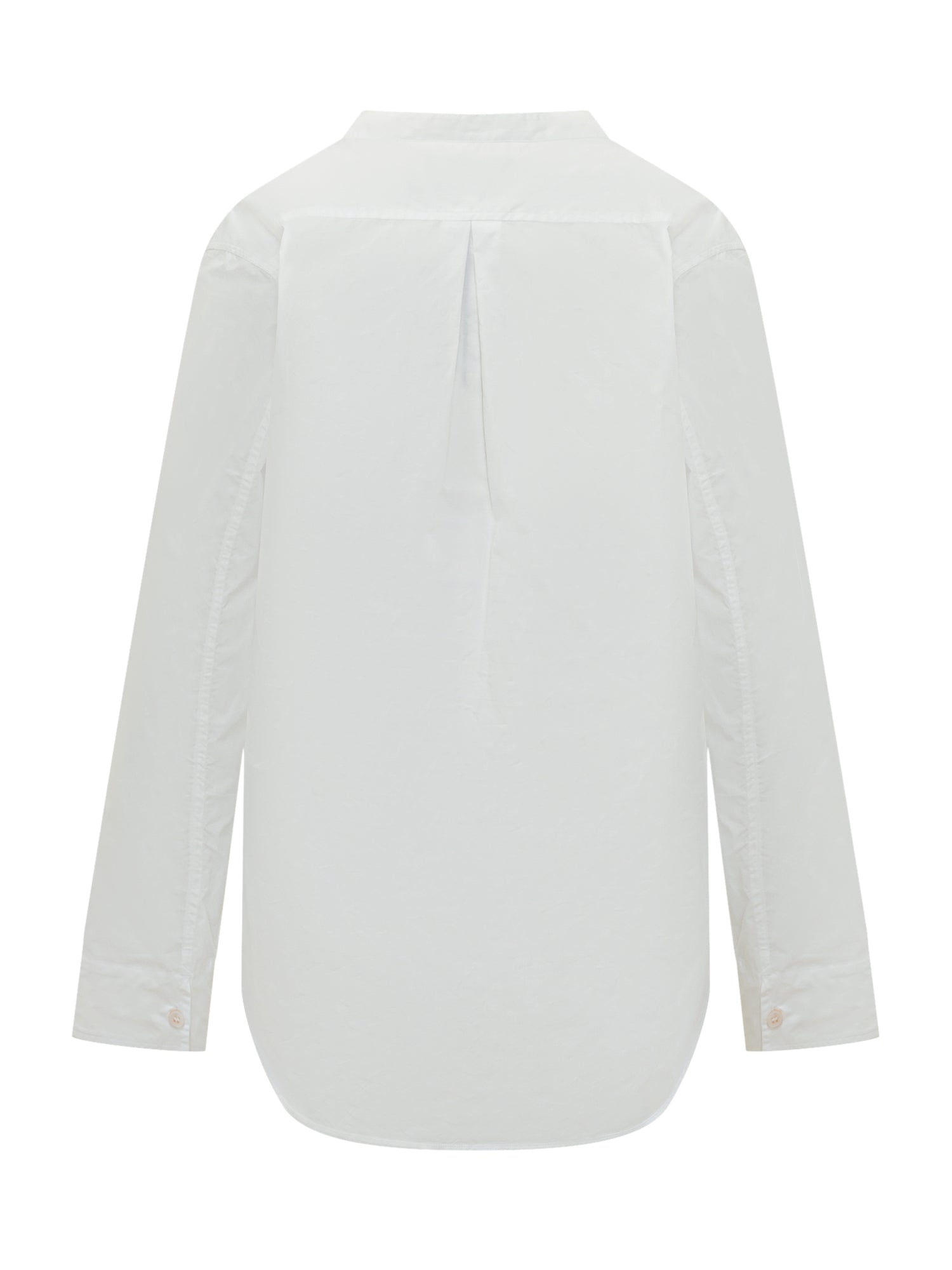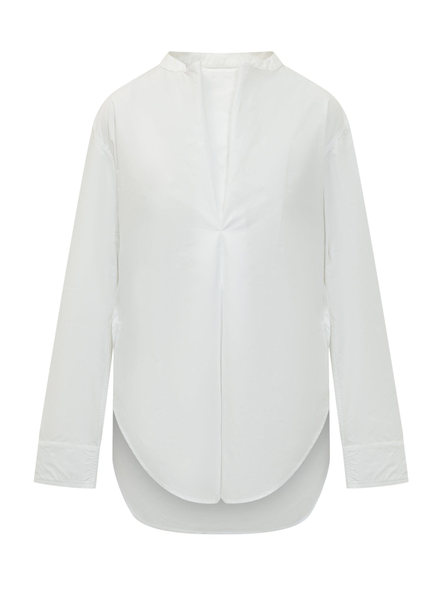Camicia dalla linea essenziale con scollatura a V profonda e costruzione pulita. Silhouette fluida con orlo arrotondato e lunghezza leggermente asimmetrica.