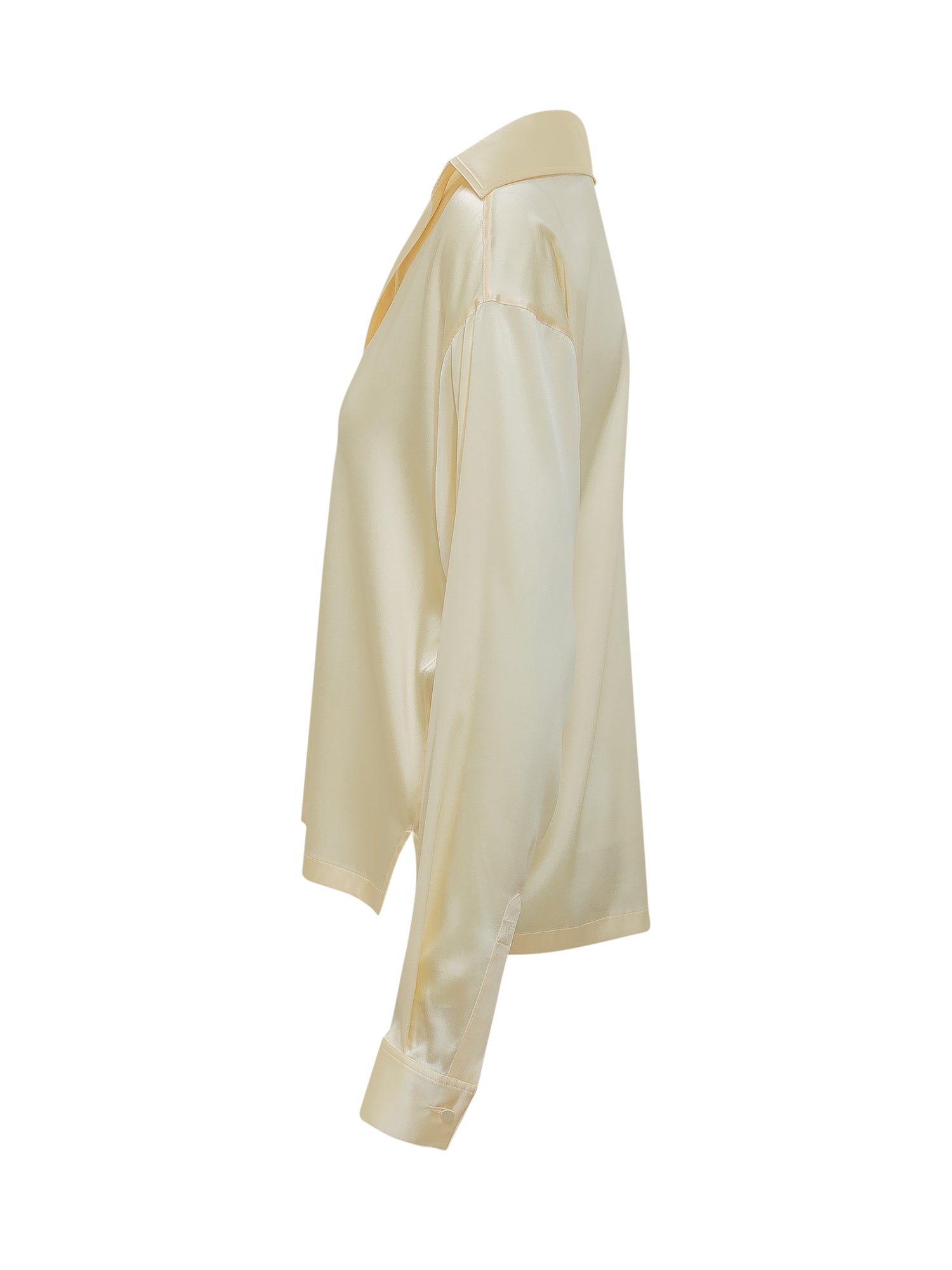 Blusa dalla linea fluida con vestibilità morbida e scollo a V profondo rifinito da colletto classico. Maniche lunghe con polsini semplici e fondo dritto. Tessuto liscio e leggero dall aspetto elegante.