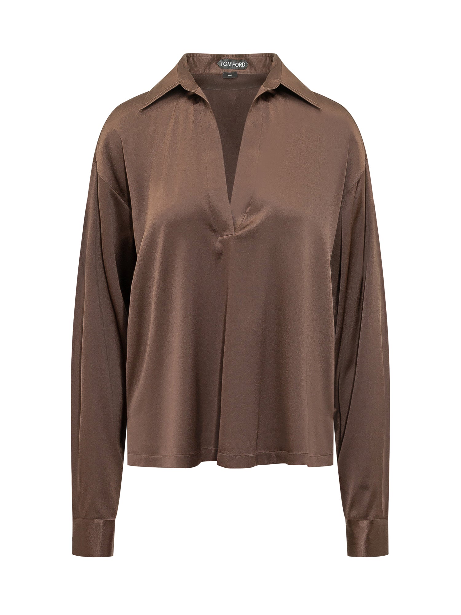 Blusa dalla linea fluida con vestibilità morbida e scollo a V profondo rifinito da colletto classico. Maniche lunghe con polsini semplici e fondo dritto. Tessuto liscio e leggero dall aspetto elegante.