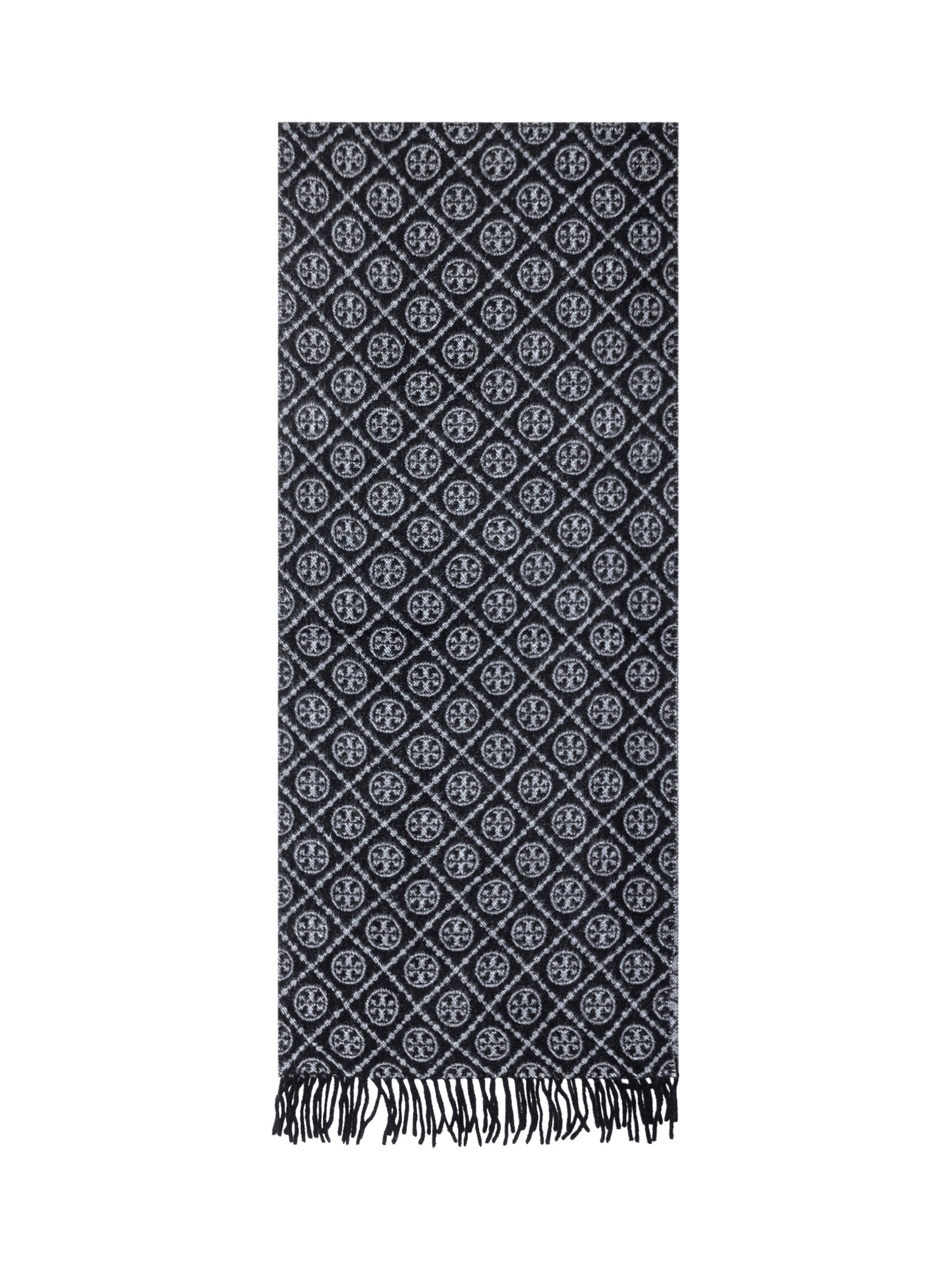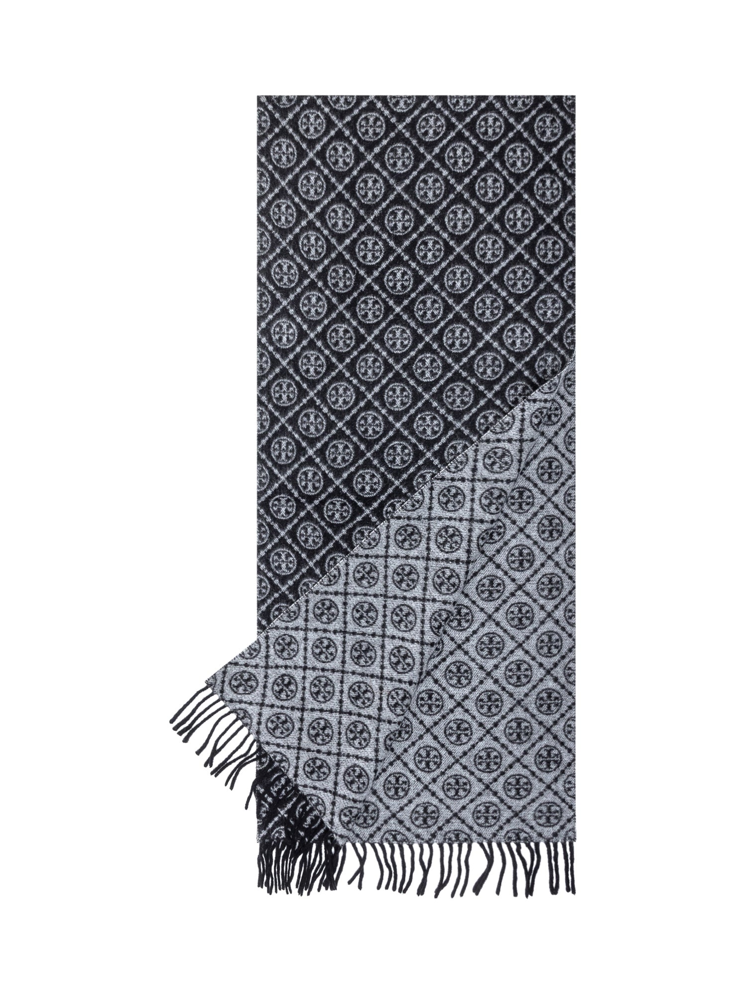 Sciarpa morbida con pattern geometrico all over e frange sul bordo.