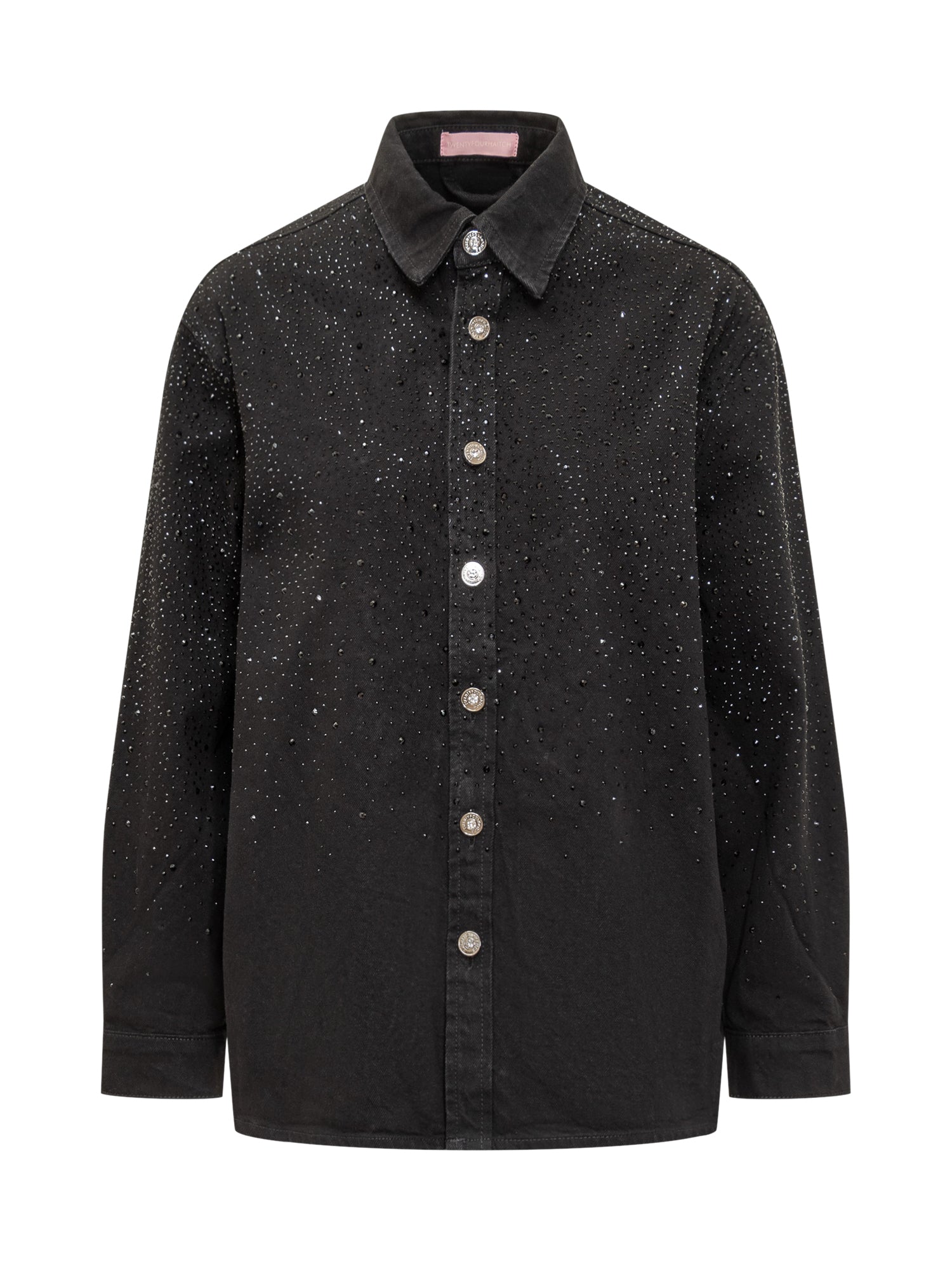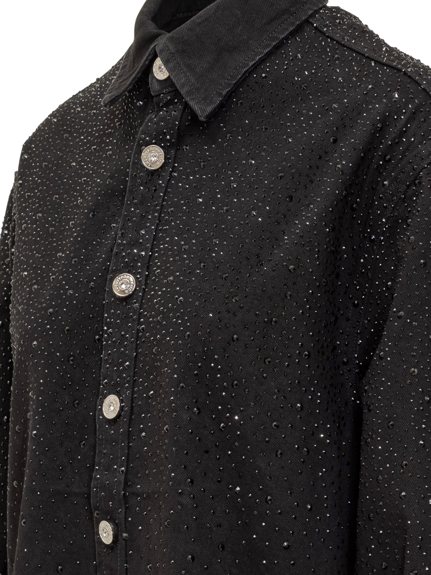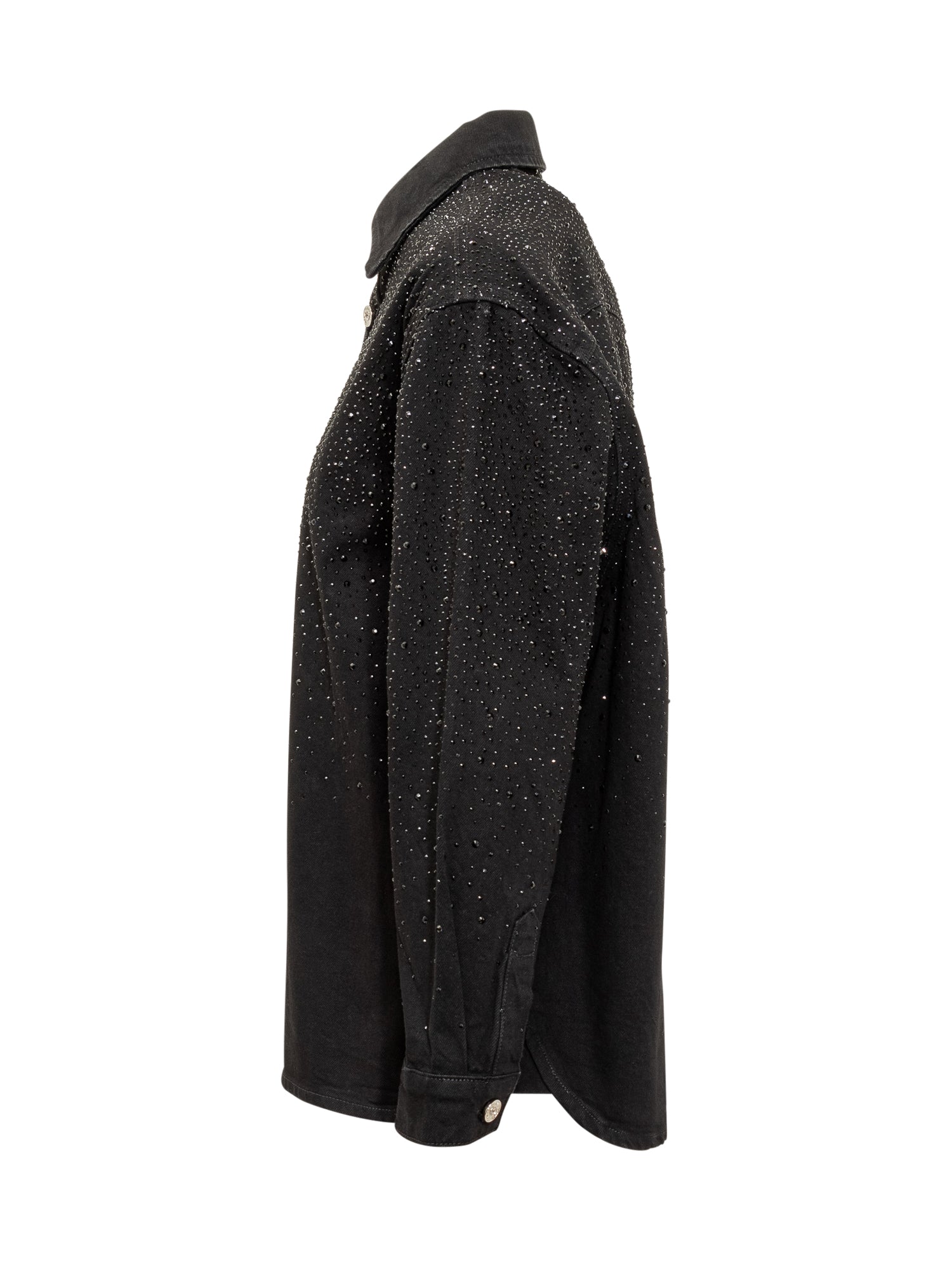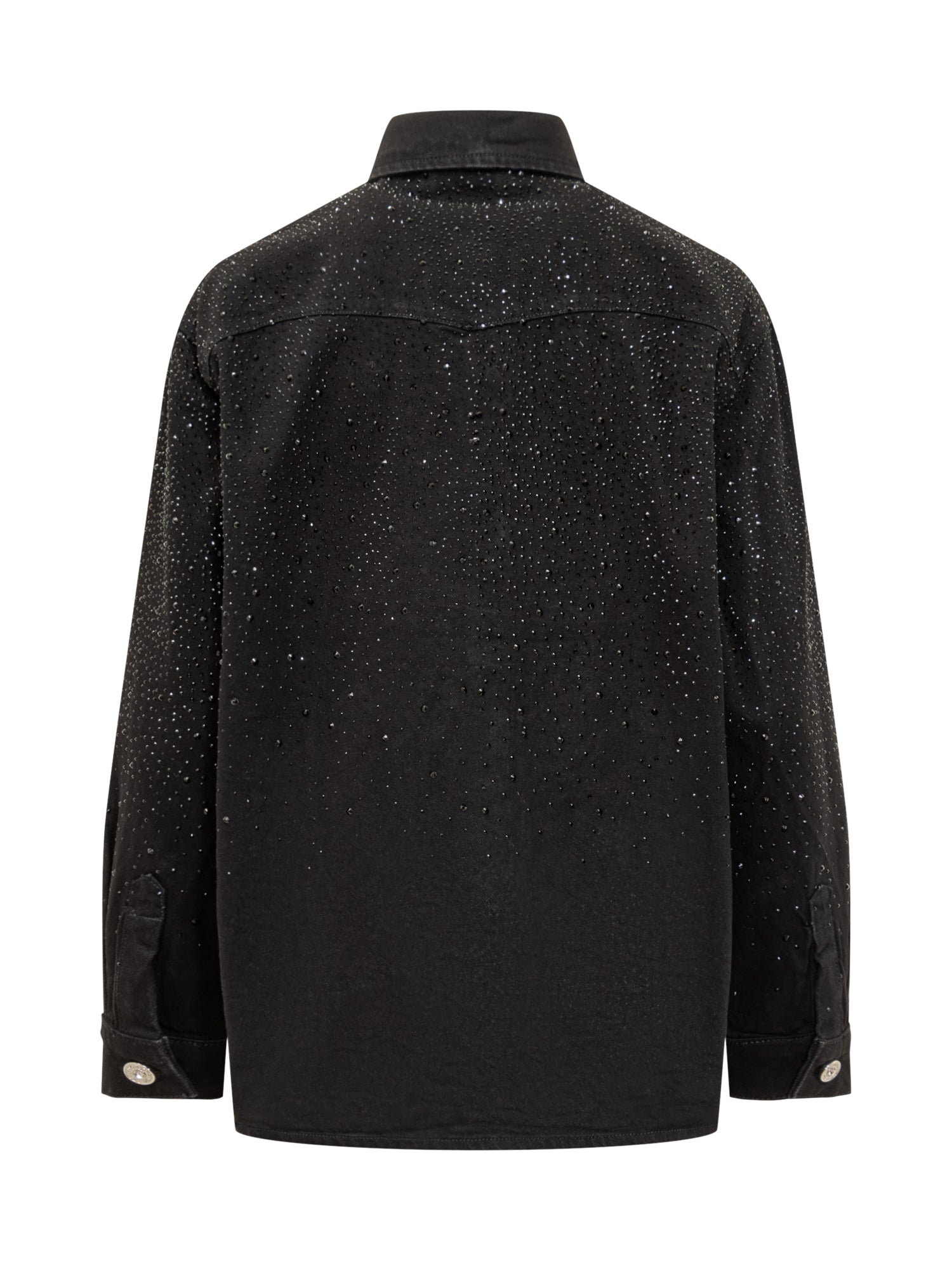 Camicia Twenty Fourhaitch in denim nero decorata con strass luminosi. Chiusura con bottoni gioiello.