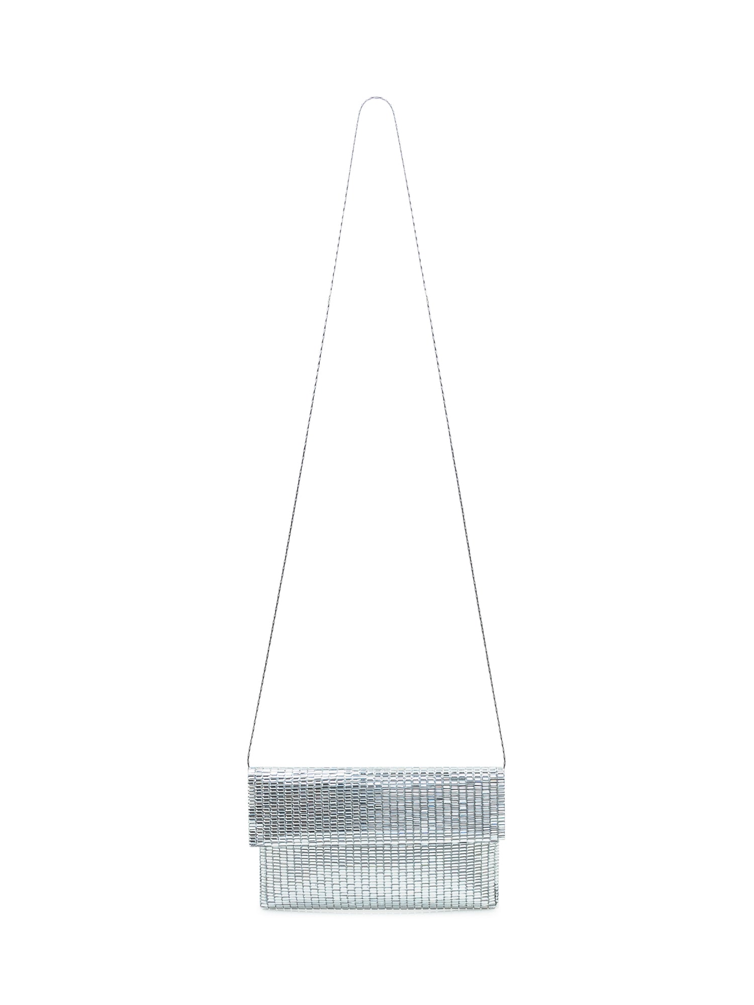 Clutch Twenty Four Haitch in maglia metallica argento dal design luminoso e moderno. Un accessorio elegante e di tendenza.