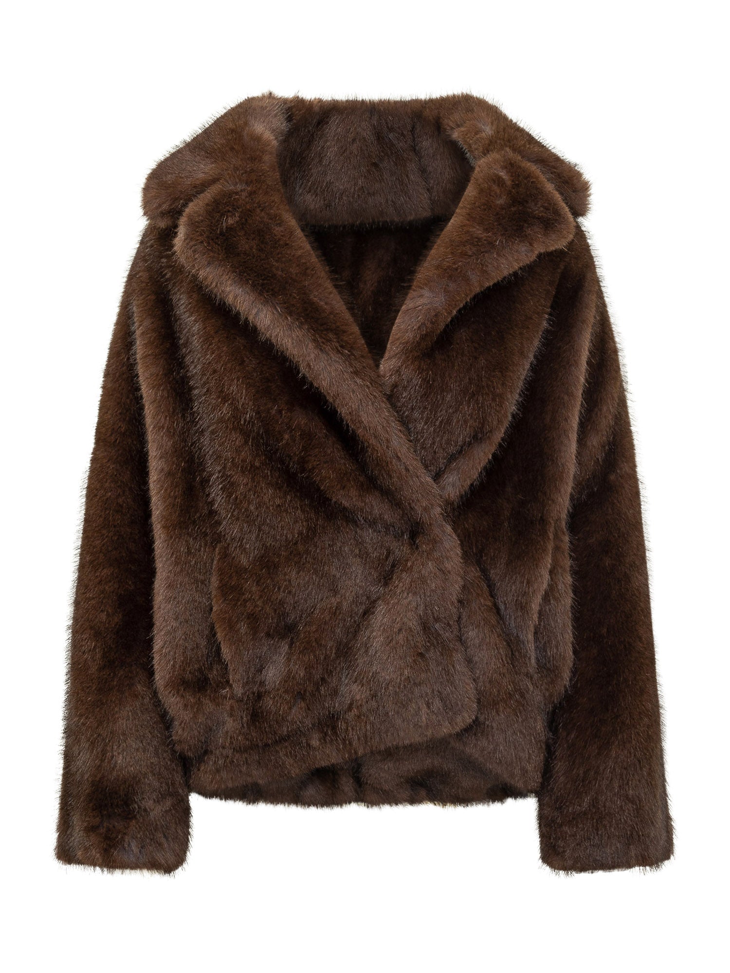 Giacca Valentini 1972 in eco pelliccia marrone con ampi revers e linea avvolgente.