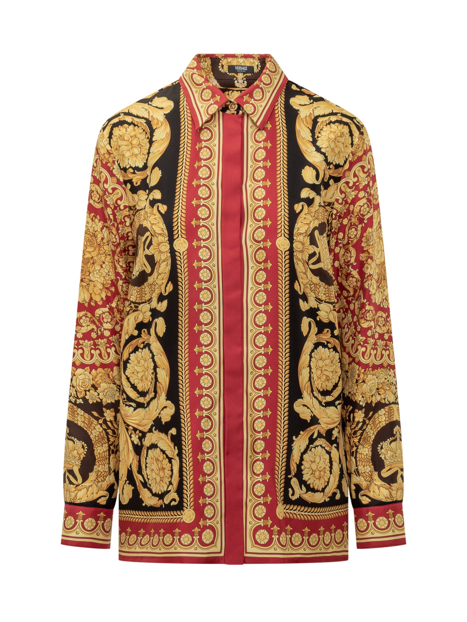 Camicia formale Versace in seta con stampa barocca multicolore. Taglio classico con colletto a punta e chiusura frontale nascosta.
