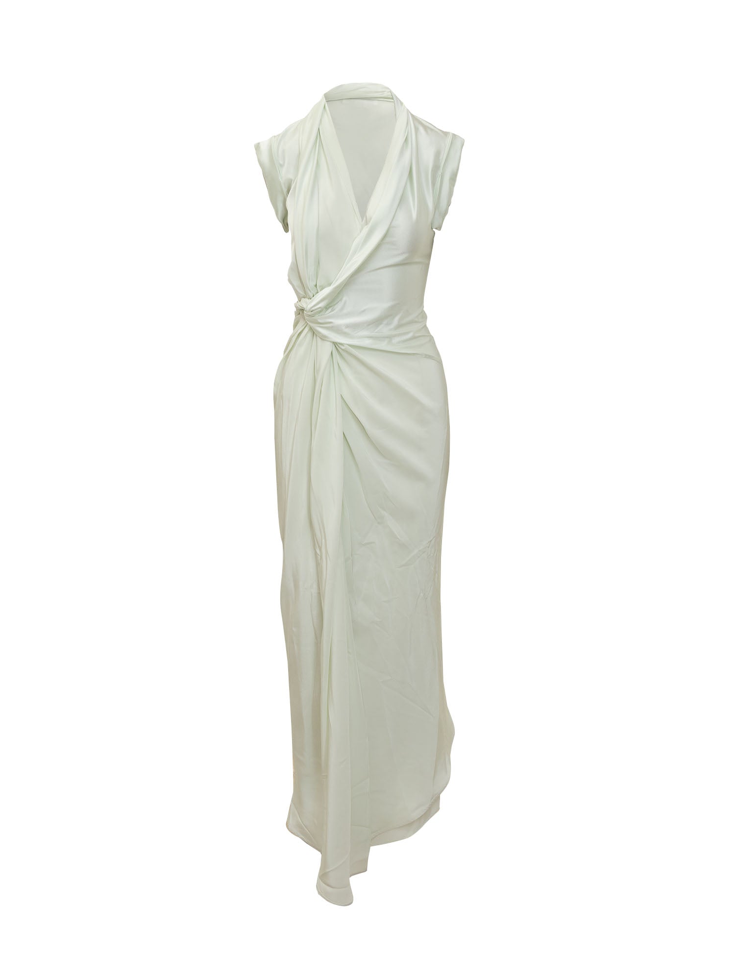 Abito lungo con scollo incrociato e nodo laterale che crea un elegante drappeggio lungo la silhouette.
