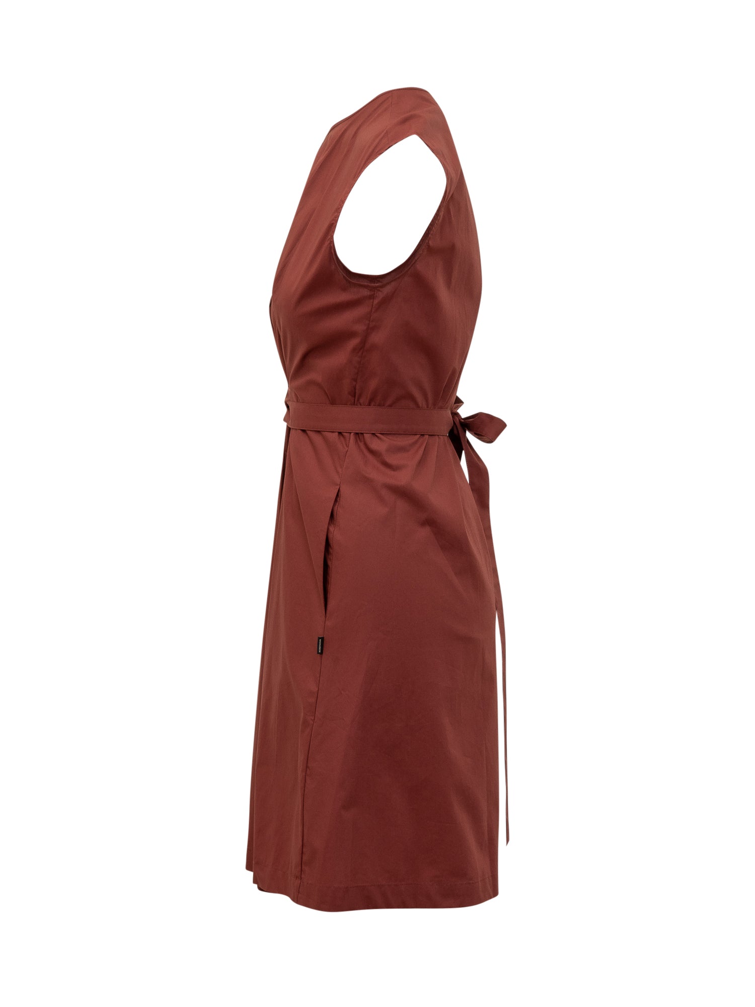 Realizzato in popeline di puro cotone. Smanicato. Chiusura con zip sul retro. Cintura in tessuto in vita. Tasche a filetto. Etichetta sul lato.