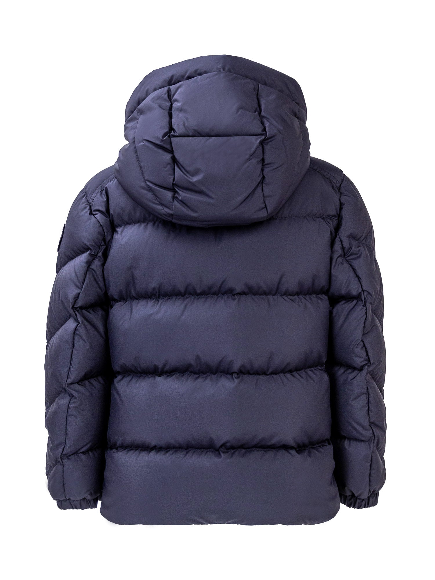 Piumino blu a maniche lunghe. Cappuccio. Tasche laterali con bottone. Chiusura con zip sul davanti. Patch Logo sulla manica.