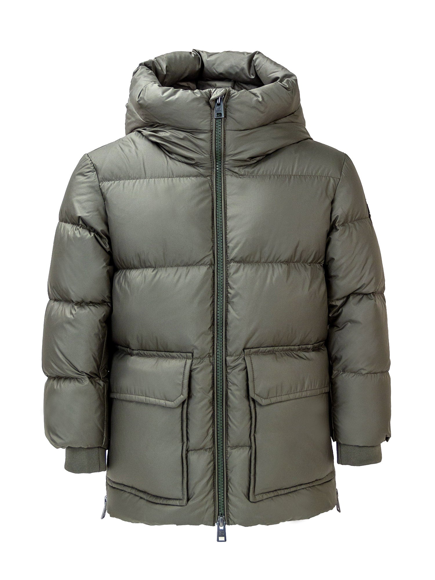 Piumino verde a maniche lunghe. Cappuccio. Polsi a costine. Tasche laterali con chiusura con patta. Due tasche interne con chiusura a strappo. Spacchi laterali con zip. Chiusura con zip sul davanti. Patch Logo sulla manica.