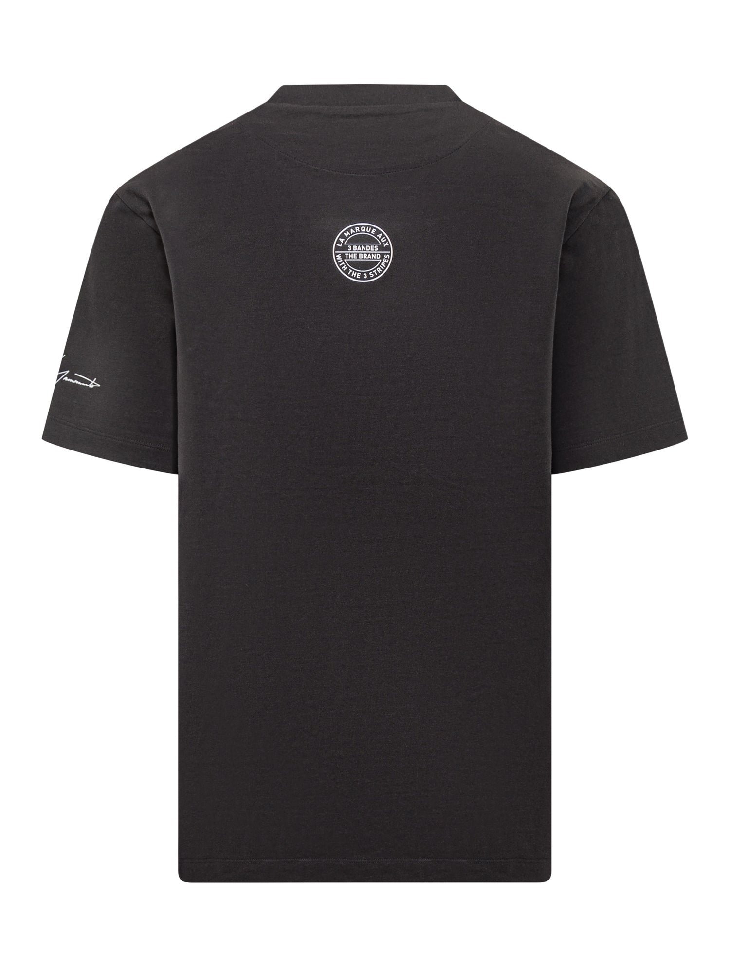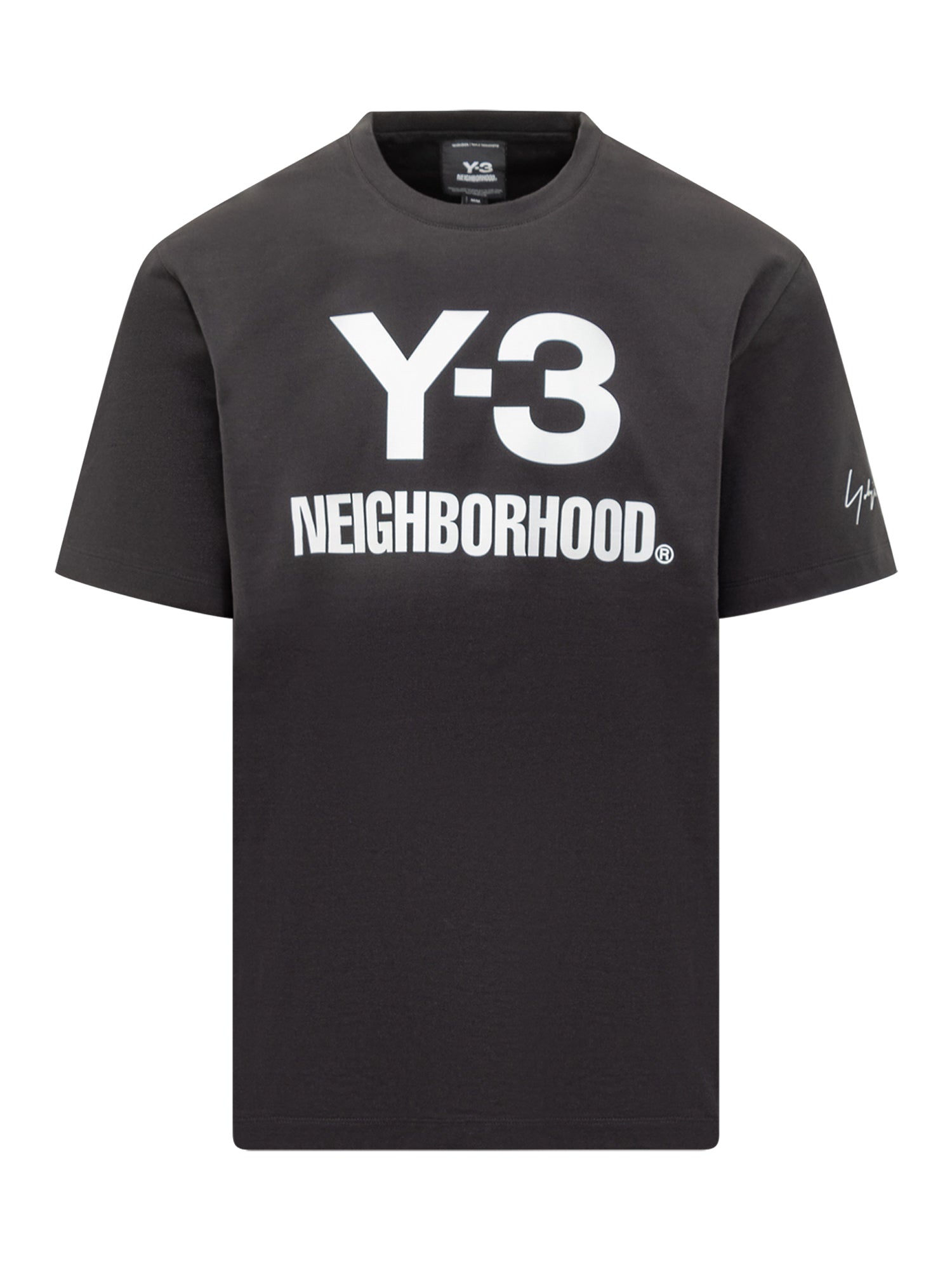 T-shirt Y-3 Neighborhood in cotone nero con maxi logo stampato a contrasto sul davanti e firma Yohji Yamamoto sulla manica.