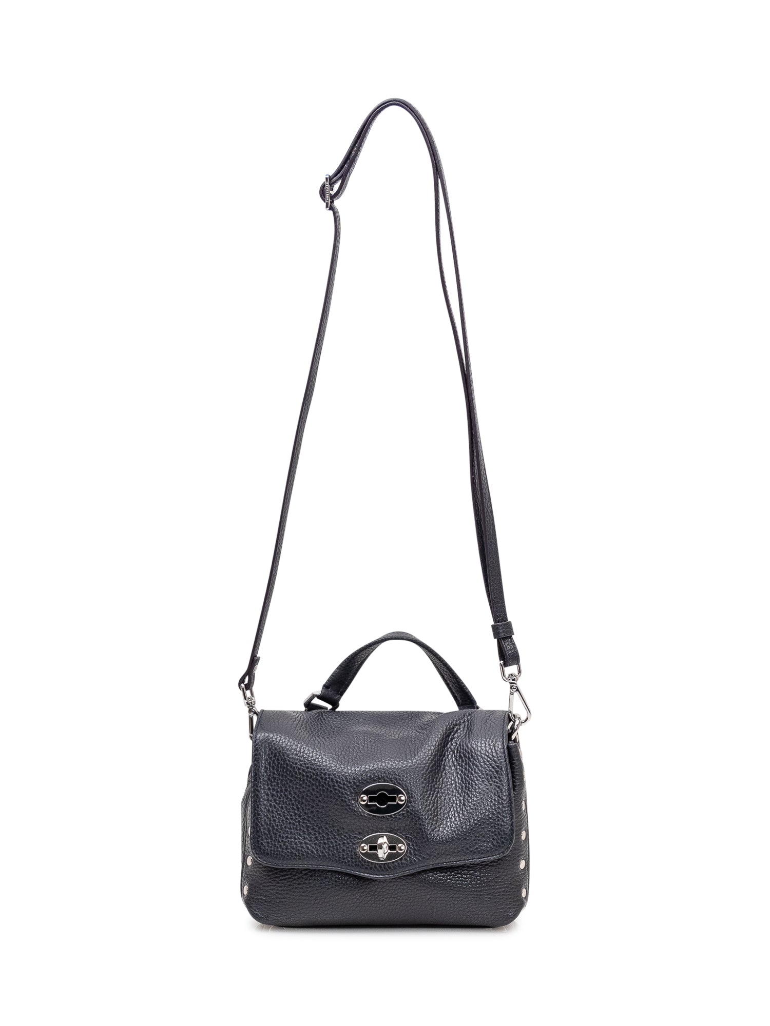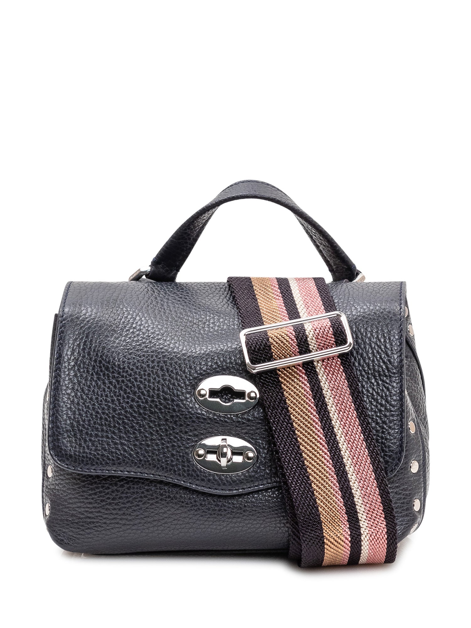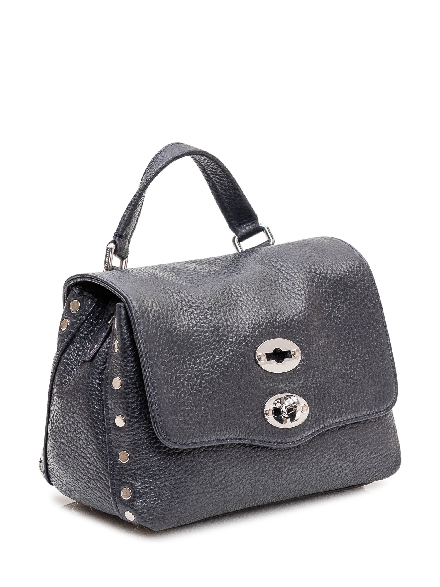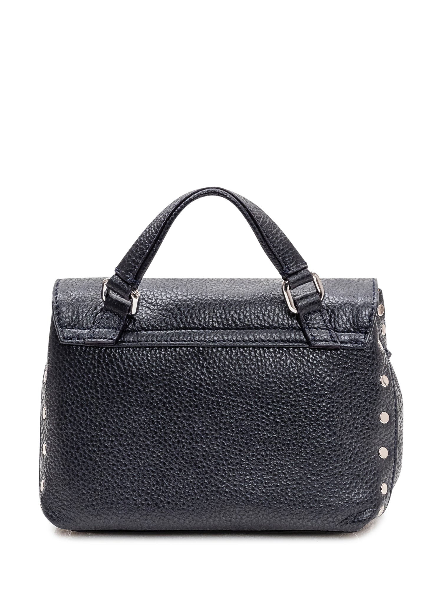 Borsa a mano compatta in pelle martellata con patta frontale e doppia chiusura iconica.Dimensioni: 20x14x11